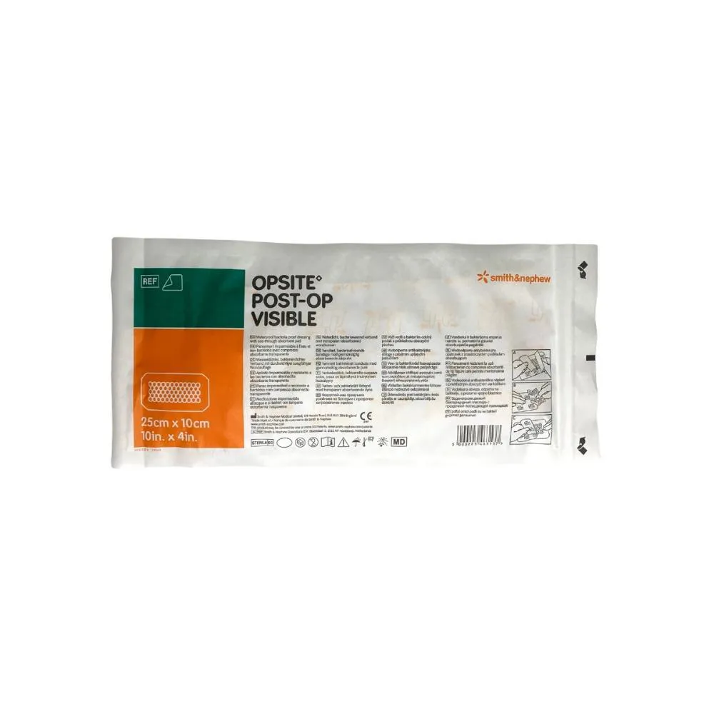 O Opsite Post-Op Visible 25 × 10 cm da Smith & Nephew é um curativo cirúrgico estéril, transparente, impermeável e respirável, indicado para proteção de incisões pós-operatórias maiores e feridas de média a grande extensão. Sua tecnologia exclusiva combina filme de poliuretano com a janela de inspeção, que permite acompanhar a evolução da ferida sem retirar o curativo. Possui também uma almofada absorvente de baixa aderência, que retém o exsudato de forma eficiente e proporciona conforto ao paciente.