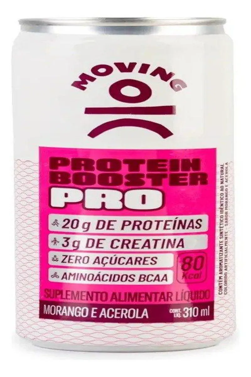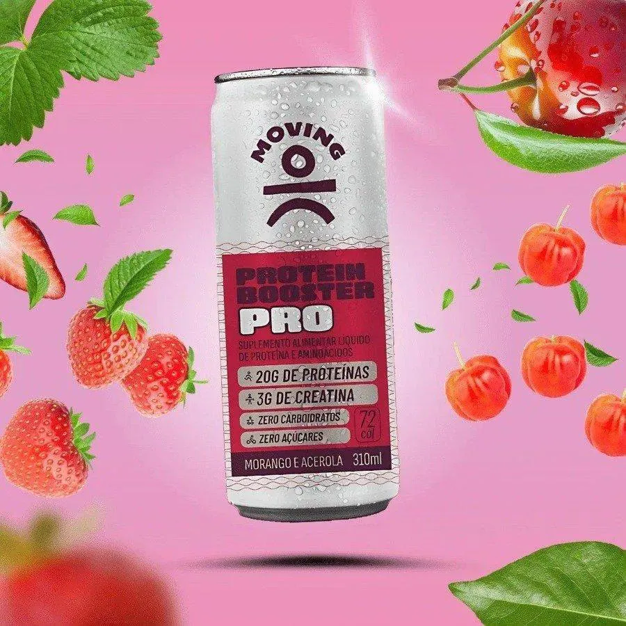 Protein Booster Moving Pro 20g Morango e Acerola 310ml – Potência e Sabor em Cada Gole Protein Booster Moving Pro oferece 20g de proteína de alta qualidade e BCAA's essenciais para garantir a recuperação muscular e promover o crescimento magro. Com zero carboidratos e sem adição de açúcares, é ideal para quem segue dietas restritas e deseja uma opção de suplementação saudável, prática e saborosa. Diferenciais Exclusivos:
