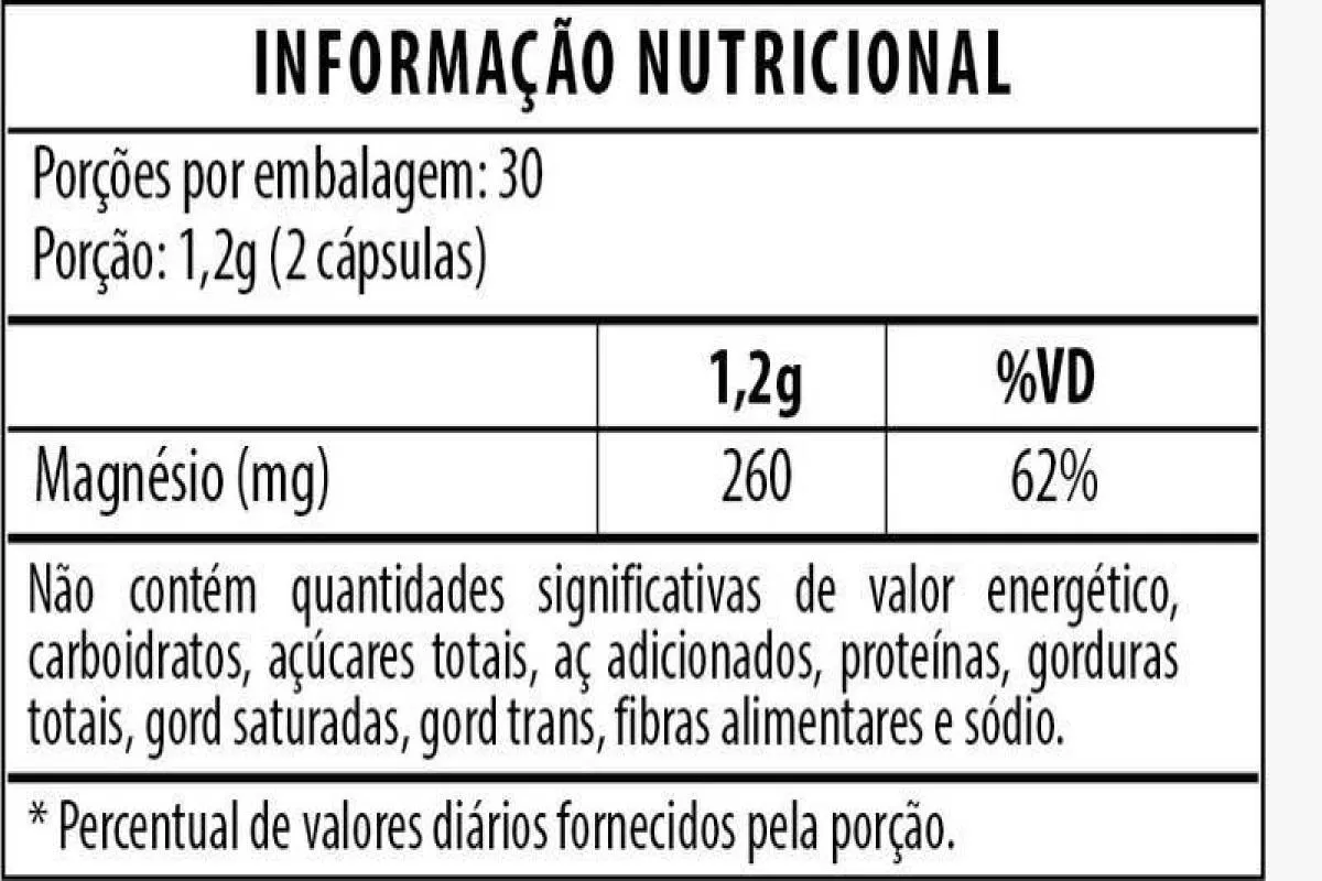 INGREDIENTES: Óxido de Magnésio, Bisglicinato de Magnésio, Ascorbato de Magnésio, Magnésio Citrato Malato, Malato de Magnésio, Taurato de Magnésio, Antiumectantes: Estearato de Magnésio, Silicato de Magnésio e Celulose Microcristalina. Composição da cápsula: Gelatina. NÃO CONTÉM GLÚTEN
