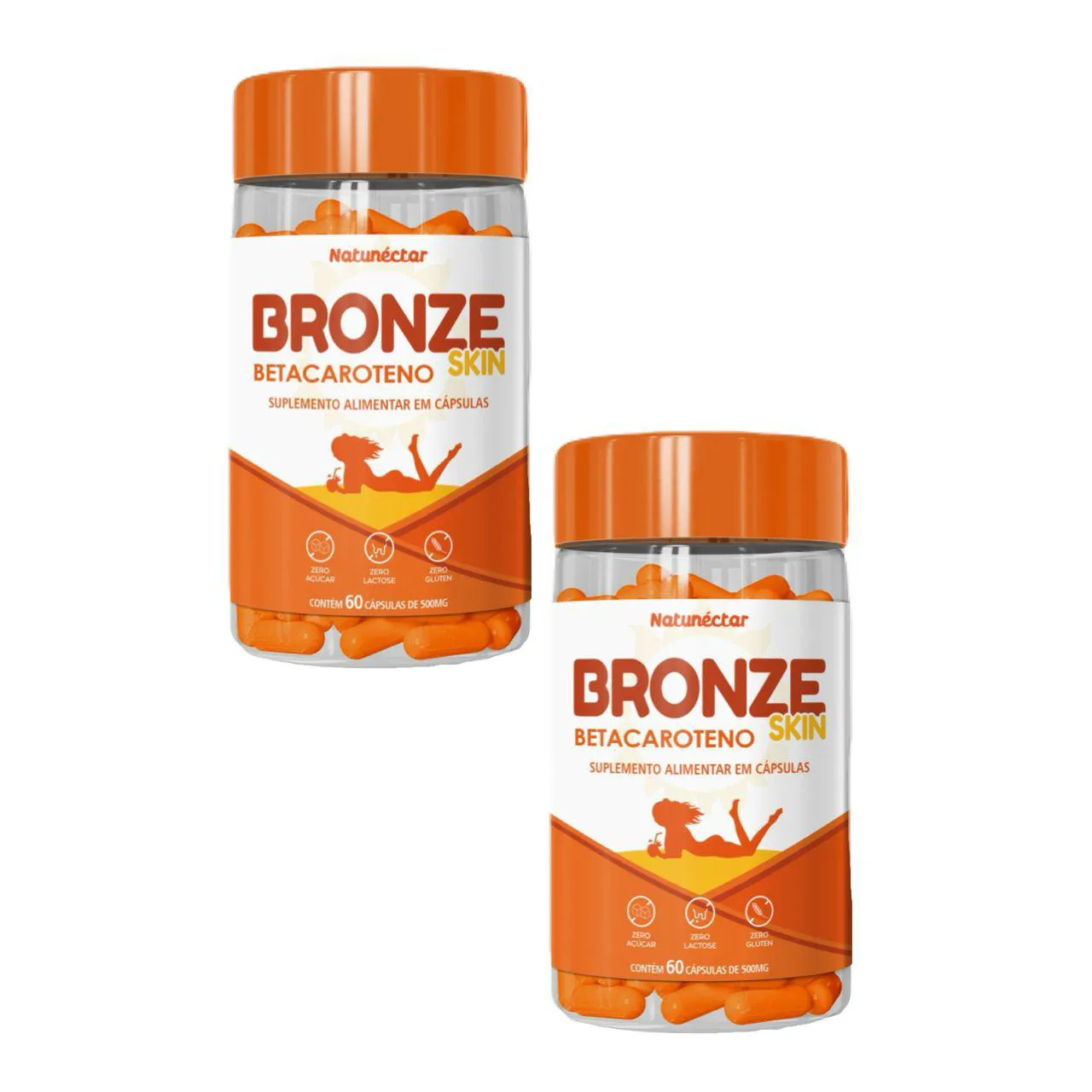BRONZE SKIN - BETACAROTENO. Kit contendo 2 frascos com 60 cápsulas cada.