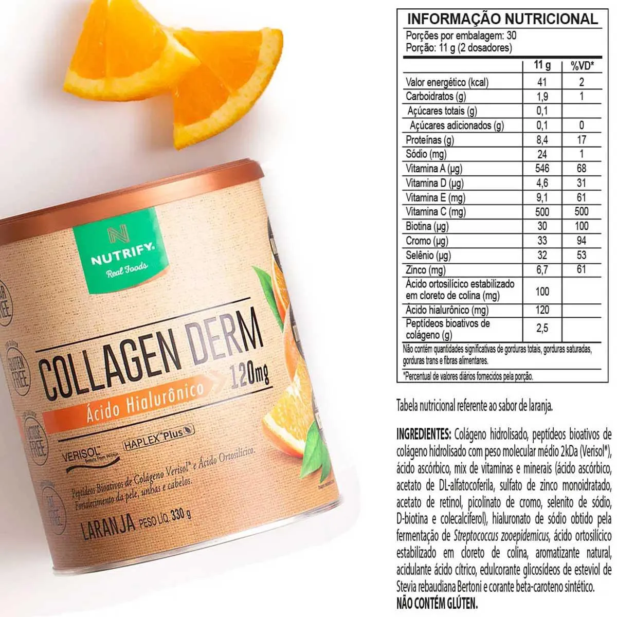INGREDIENTES: Colágeno hidrolisado, peptídeos bioativos de colágeno hidrolisado (Verisol®), ácido ascórbico, mix de vitaminas e minerais (ácido ascórbico, acetato de DL-alfatocoferila, sulfato de zinco monoidratado, acetato de retinol, picolinato de cromo, selenito de sódio, D-biotina e colecalciferol), hialuronato de sódio, ácido ortosilícico estabilizado em cloreto de colina, acidulante ácido cítrico, aromatizantes naturais, edulcorante glicosídeos de esteviol de Stevia rebaudiana Bertoni.