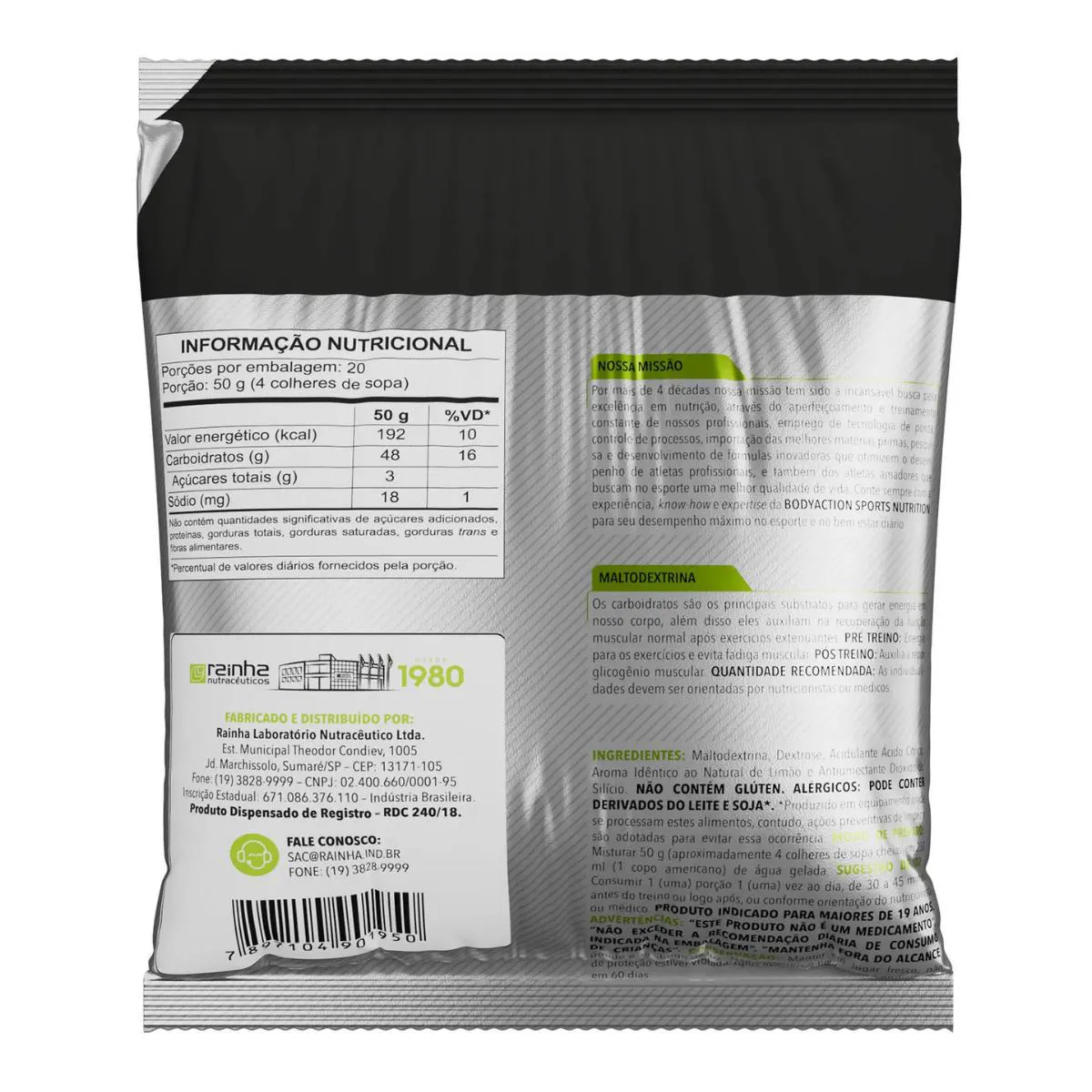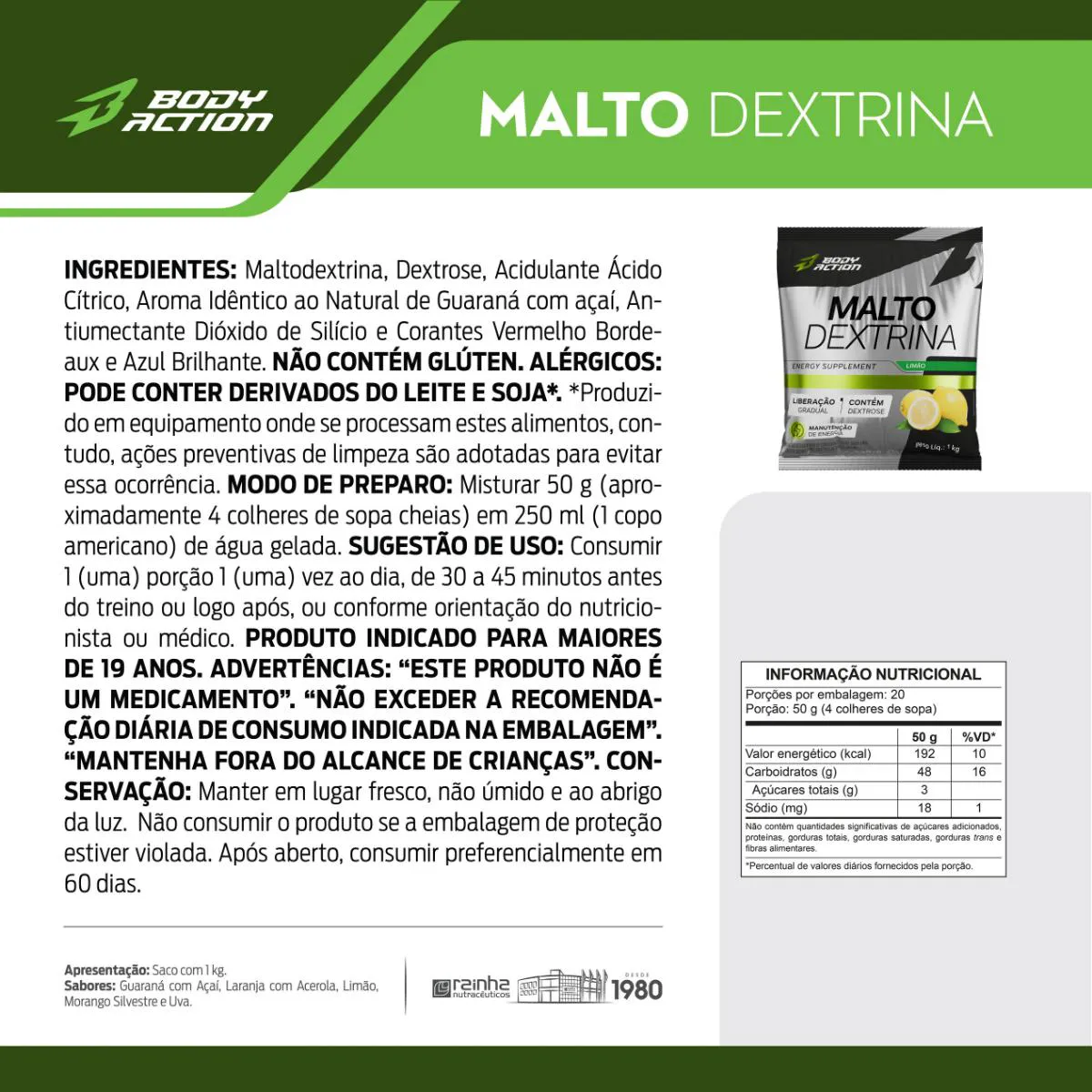 A Maltodextrina Body Action é um suplemento alimentar composto por maltodextrina e dextrose, com sabor de limão, desenvolvido para atletas e praticantes de atividade física. Sua fórmula é projetada para fornecer energia rápida e auxiliar no desempenho físico antes, durante e após os exercícios.