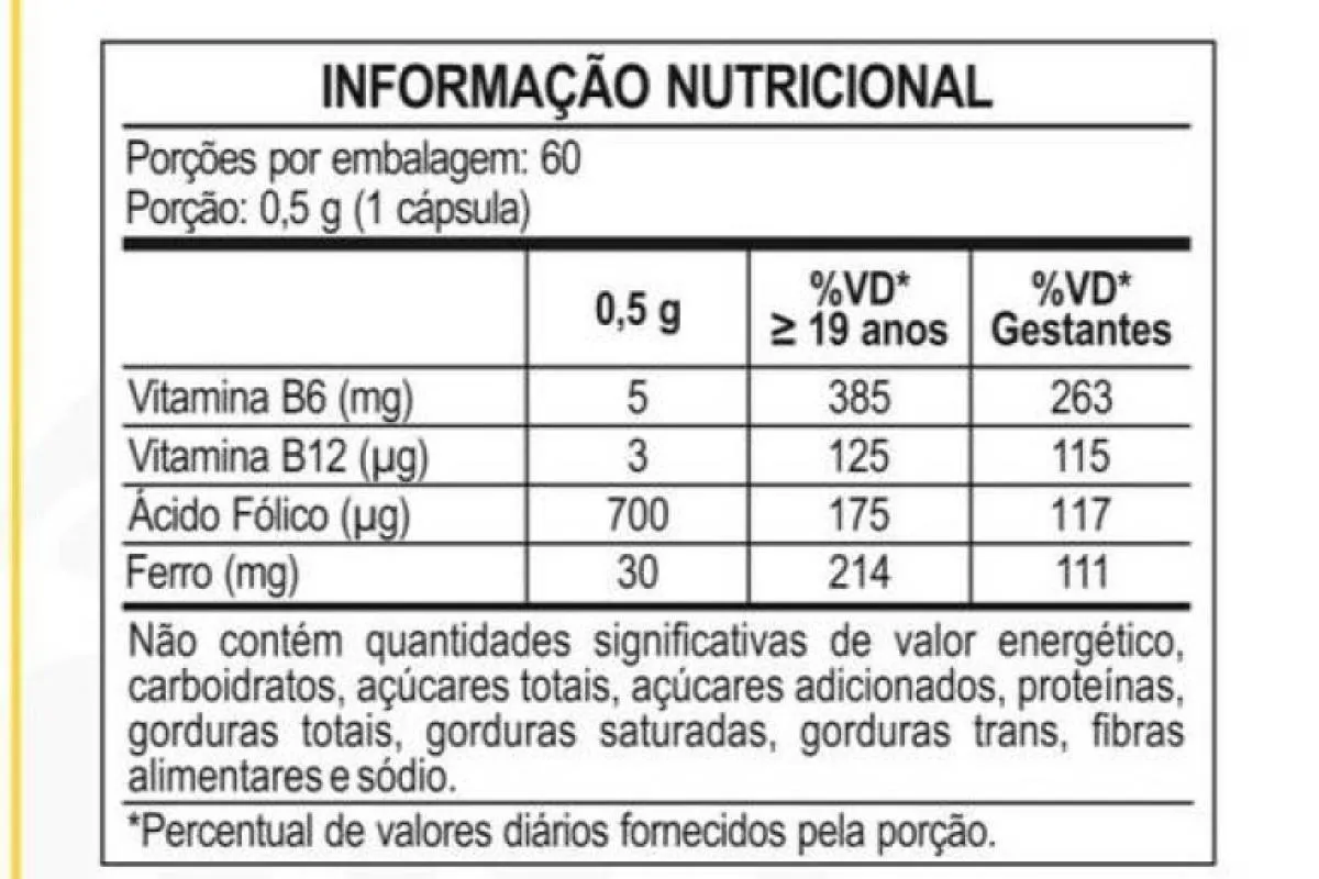 Bisglicinato ferroso, vitamina B6 (cloridrato de piridoxina), ácido fólico (L-metilfolato de cálcio) e vitamina B12 (metilcobalamina). Silicato de magnésio. Composição da cápsula: gelificante gelatina e corante dióxido de titânio.