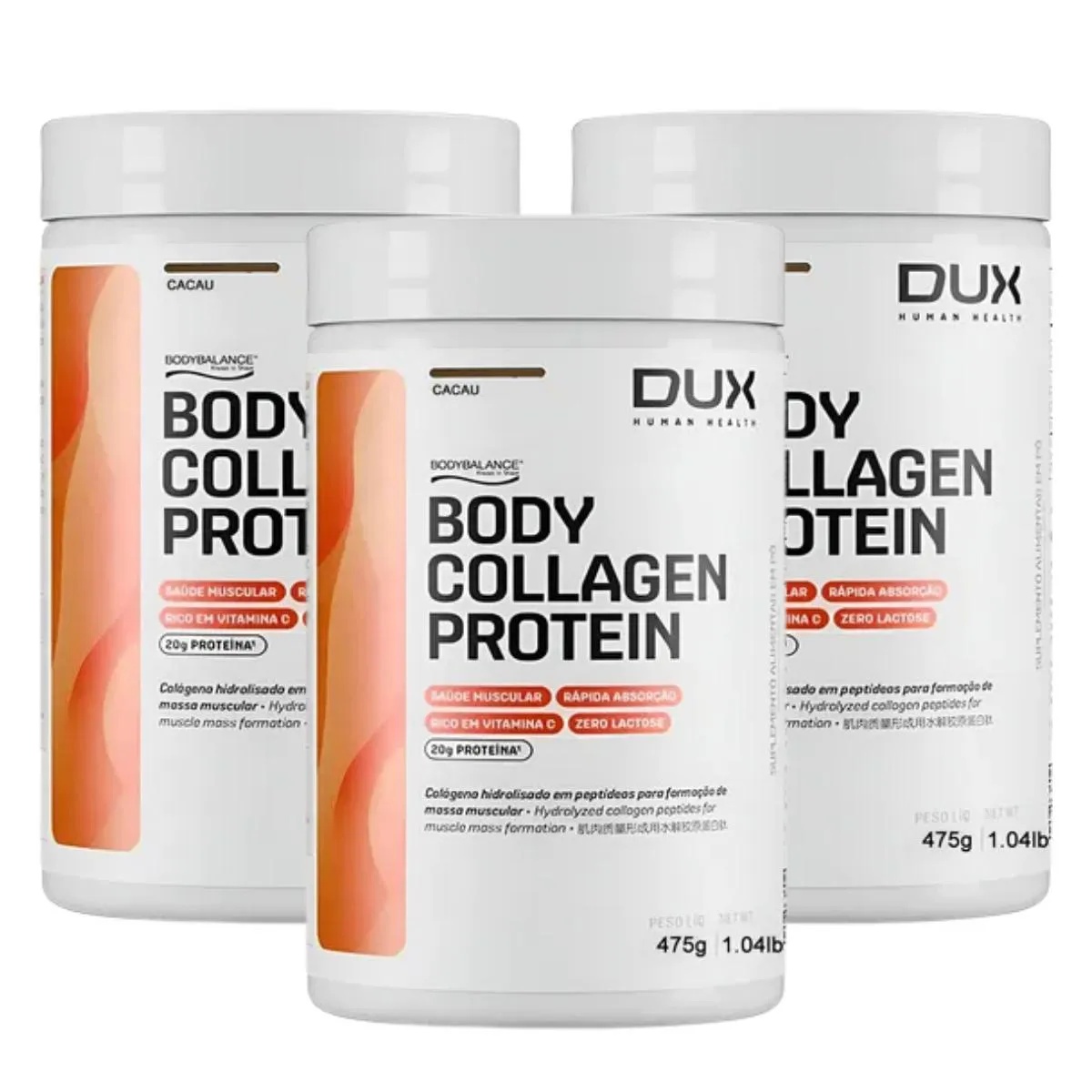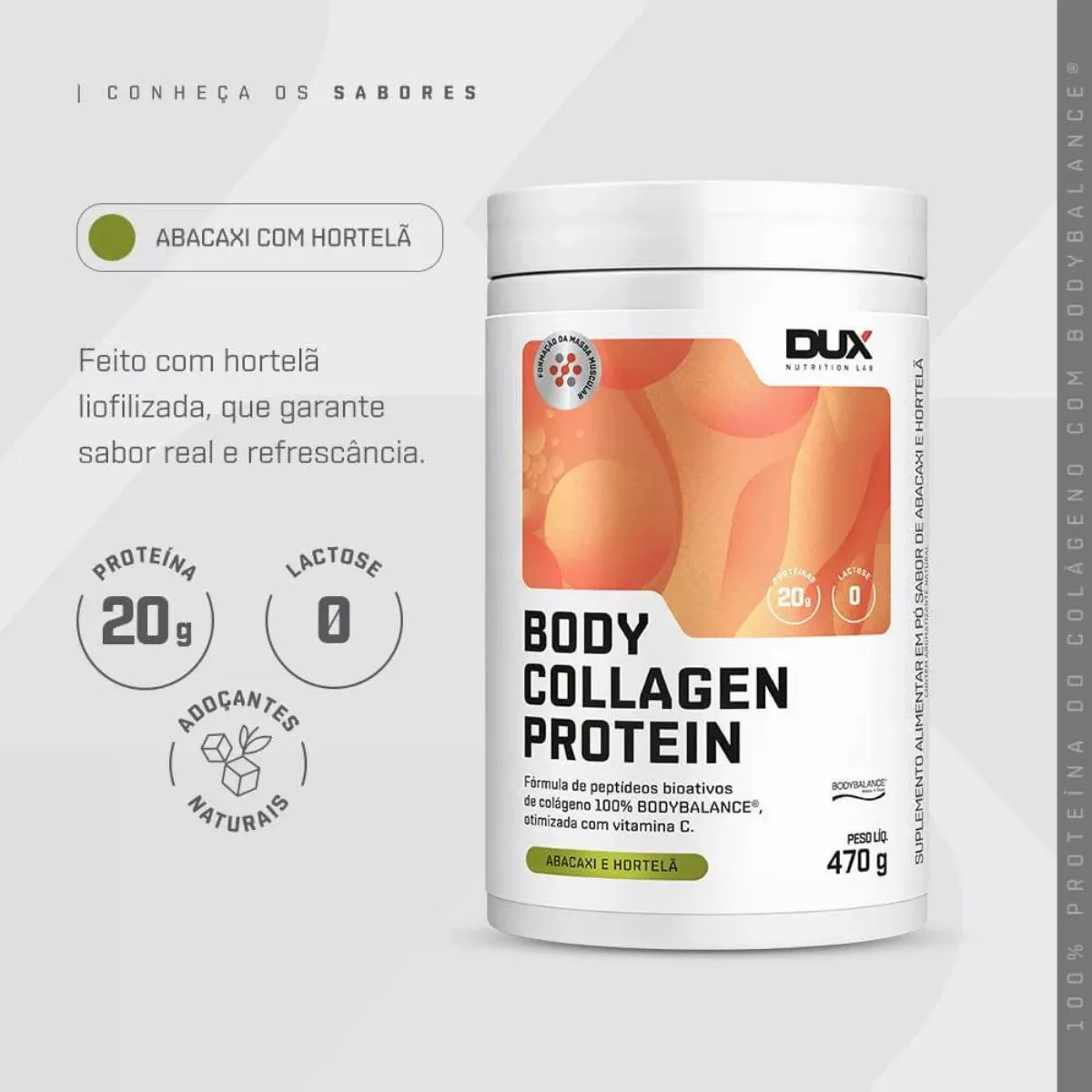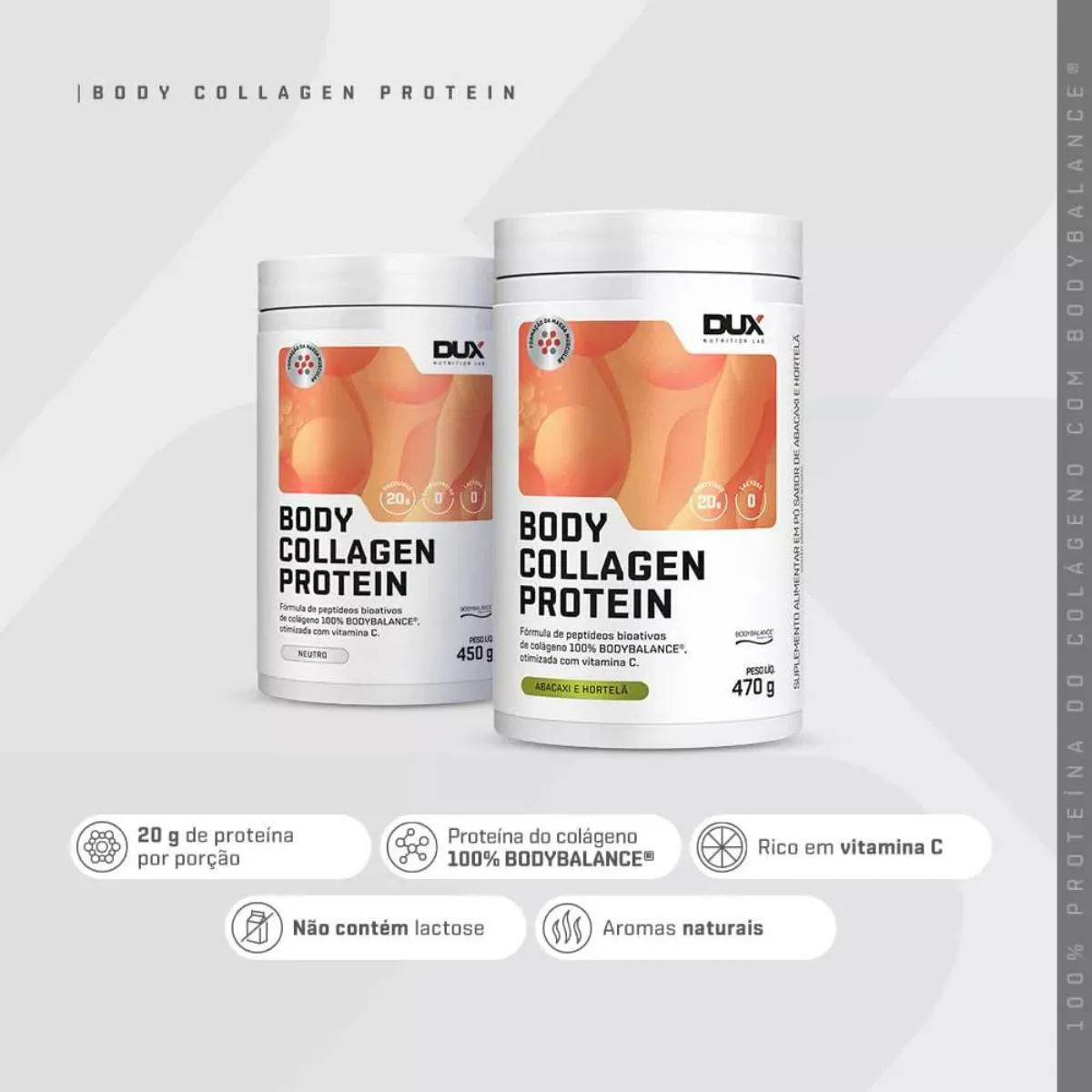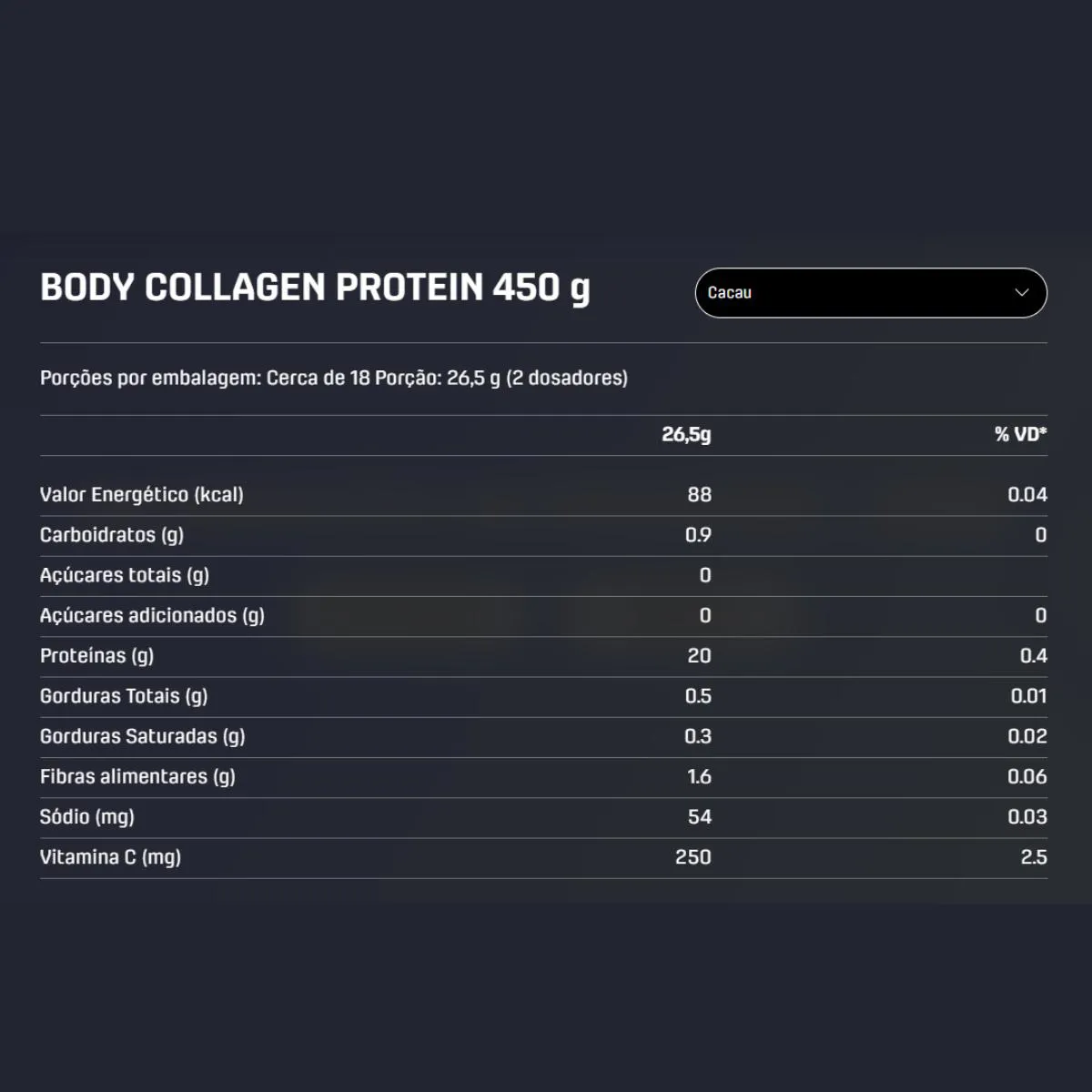 Nosso Body Collagen Protein é um suplemento desenvolvido com colágeno hidrolisado em peptídeos BodyBalance e vitamina c, com benefícios para manutenção da saúde muscular, metabolismo de proteínas e gorduras e funcionamento do sistema imune. Possui 20 g de proteína por porção e tecnologia alemã com comprovação clínica e científica de resultados. A proteína é um componente importante de todas as células do corpo. Nosso organismo a utiliza, principalmente para construir tecidos, sendo, portanto, um componente fundamental de ossos, músculos, entre outras estruturas. O colágeno – proteína funcional mais abundante no organismo – possui diversas funções fisiológicas importantes, como mobilidade das articulações, saúde dos músculos, ligamentos, tendões e articulações e a hidratação, resistência e elasticidade da pele. É um componente essencial para nossa saúde e bem-estar. A proteína do colágeno não possui lactose e apresenta alta digestibilidade e absorção, sendo uma excelente forma de aumentar a ingestão diária de proteína. Ingredientes: Colágeno hidrolisado, cacau em pó - Barry Callebaut, ascorbato de cálcio (vitamina C), aromatizantes naturais e edulcorantes glicosídeos de esteviol de Stevia rebaudiana Bertoni e taumatina. NÃO CONTÉM GLÚTEN.