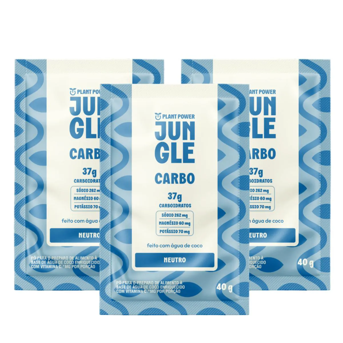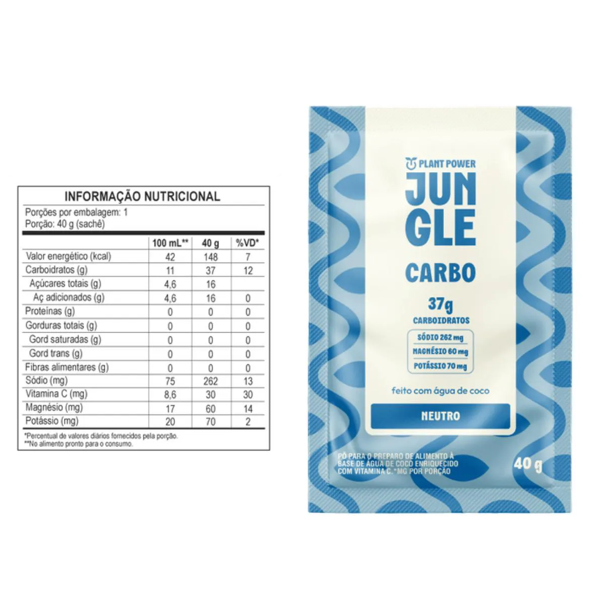 O produto é um sachê de suplemento nutricional da linha Carbo da marca Jungle, com sabor neutro, desenvolvido para atletas e praticantes de atividade física. Serve para fornecer carboidratos, eletrólitos e vitamina c, auxiliando na reposição energética e de minerais durante ou após exercícios, com uma fórmula limpa, sem açúcar, conservantes, corantes ou aditivos sintéticos.