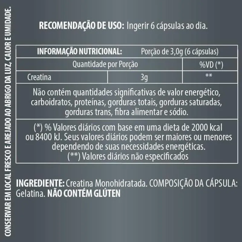 Kit Com 04 Unidades. INGREDIENTE: Creatina Monohidratada. NÃO CONTÉM GLÚTEN . RECOMENDAÇÃO DE USO: Ingerir 6 cápsulas ao dia.
