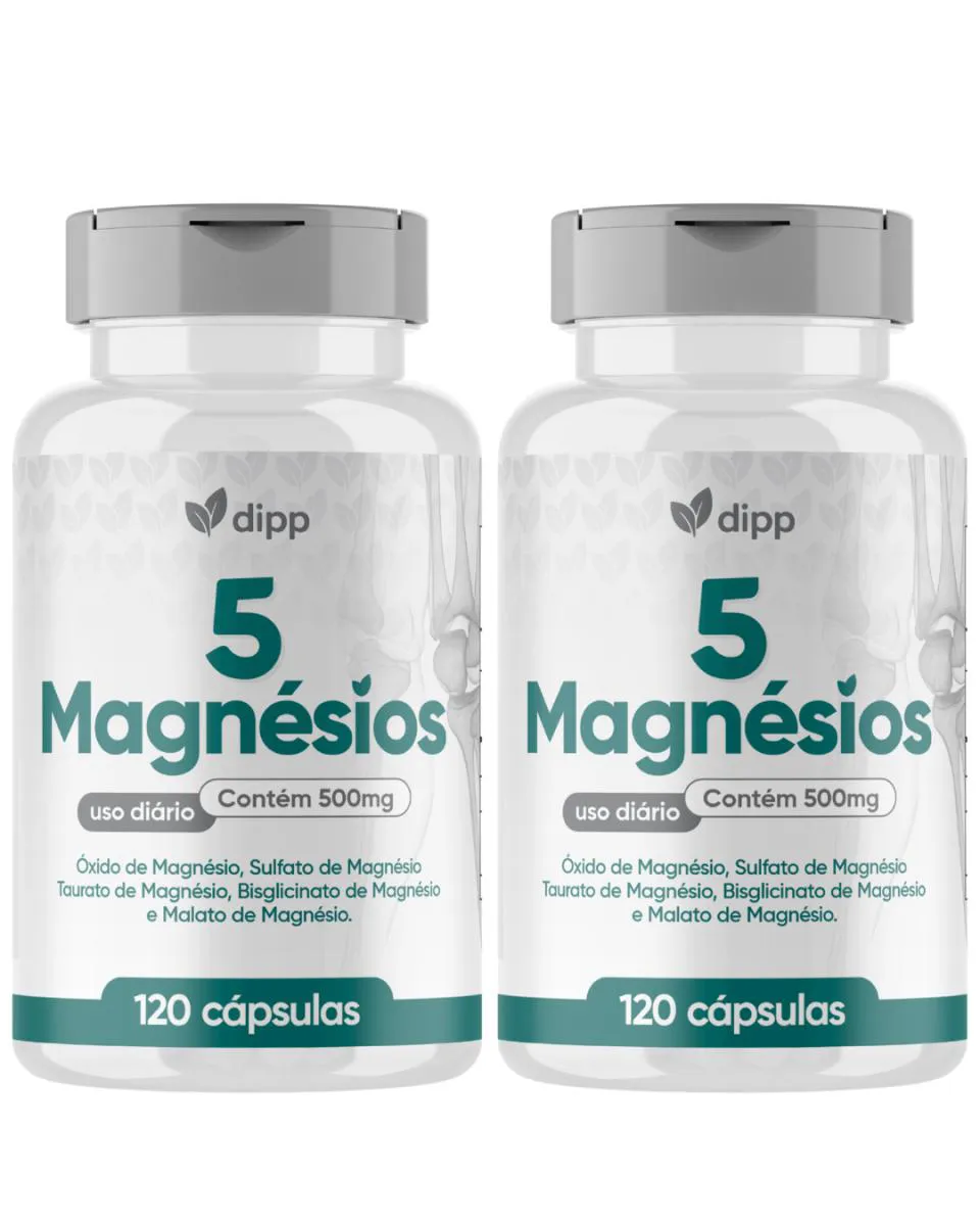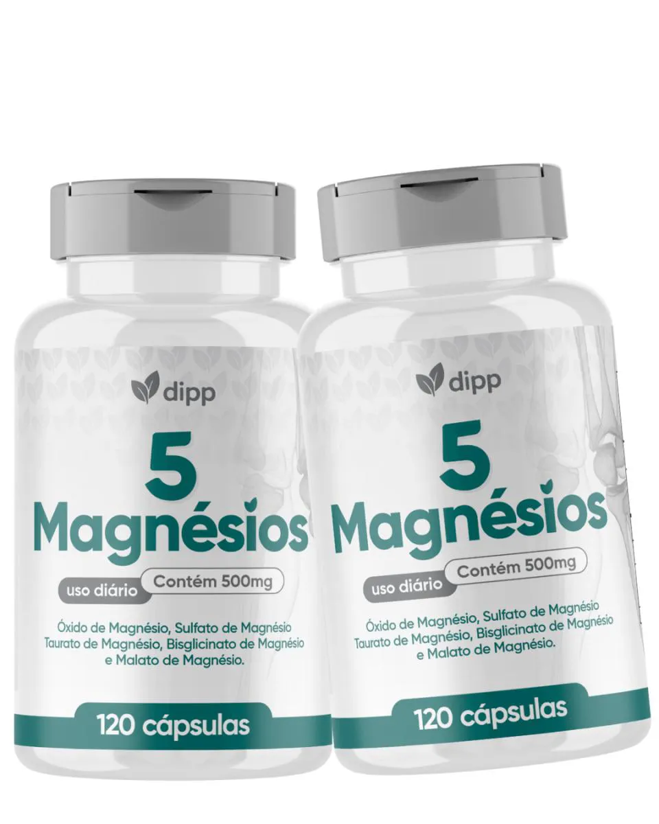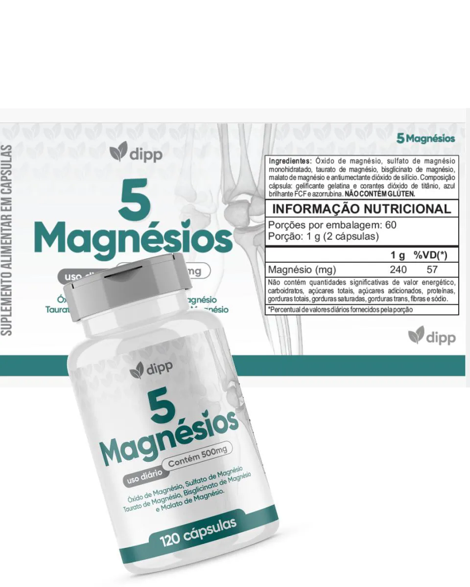 5 Magnésio 120 cápsulas.Contém 2 Frascos.O 5 Magnésios DIPP foi desenvolvido para quem busca um suplemento completo e eficiente, unindo o melhor das diferentes fontes de magnésio em uma única cápsula. Sua fórmula combina cinco formas de magnésio: óxido, sulfato monohidratado, taurato, bisglicinato e malato, proporcionando suporte amplo ao organismo.O magnésio é essencial para diversas funções vitais, incluindo metabolismo energético, funcionamento muscular e neuromuscular, além de contribuir para a formação e manutenção de ossos e dentes. Ao combinar diferentes tipos de magnésio, o produto oferece uma absorção superior e mais eficiente, garantindo melhor aproveitamento pelo corpo.Cada dose foi formulada para proporcionar maior conforto digestivo, graças à presença de fontes de alta biodisponibilidade como bisglicinato, taurato e malato.
