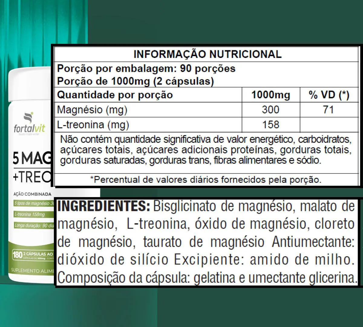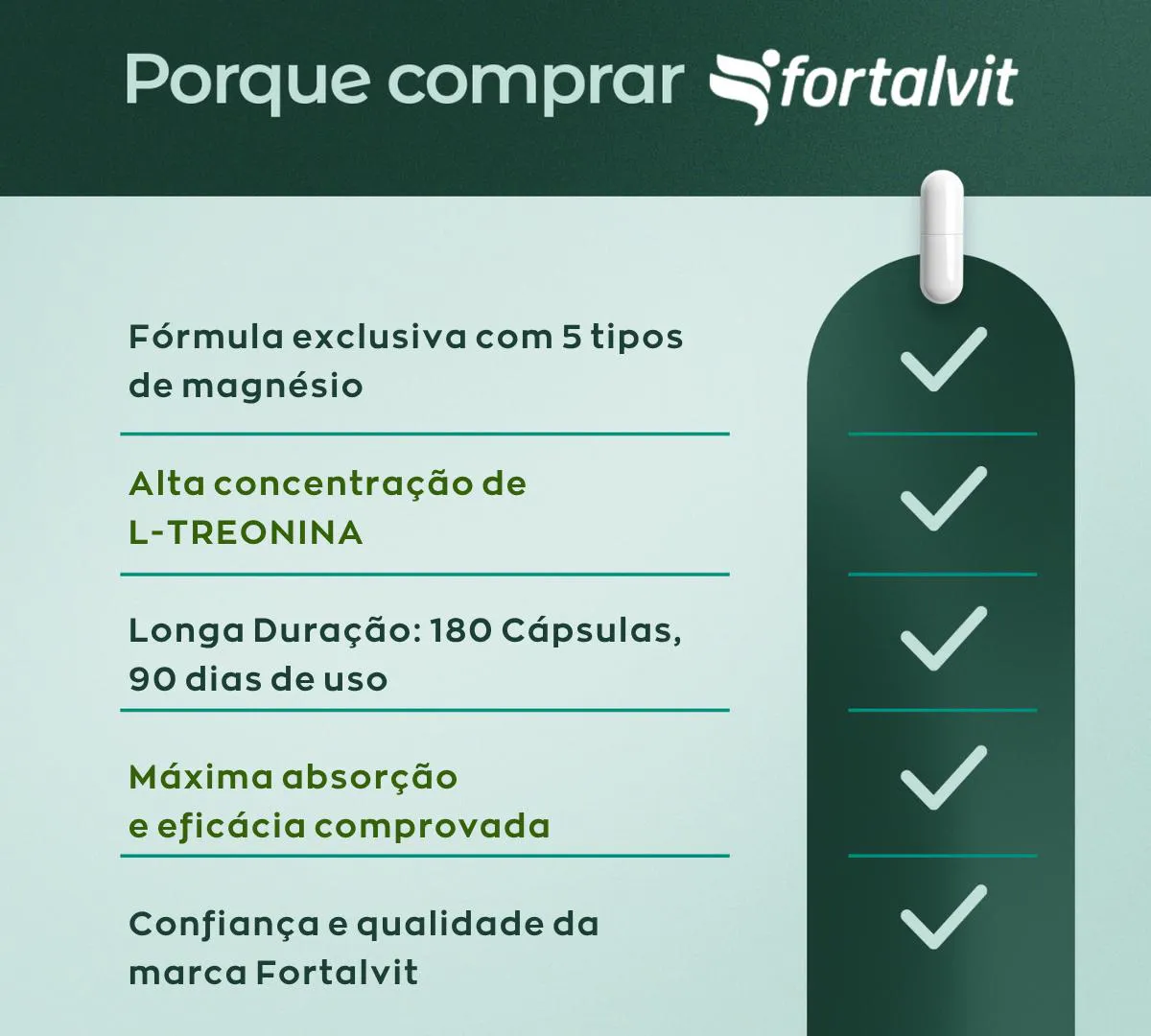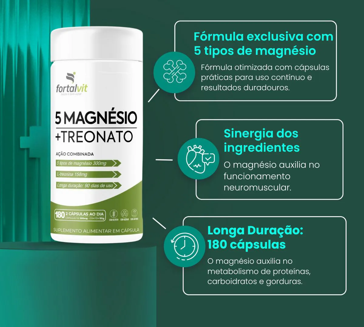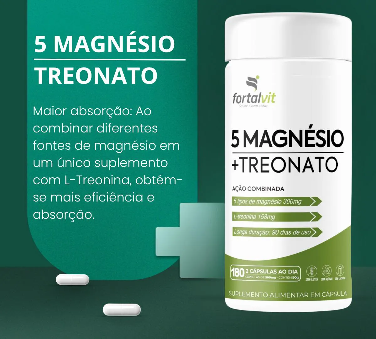 5Mag Treonato Longa Duração: 180 Cápsulas, 90 Dias de Uso, Treonato + 5 tipos de Magnésio, Fortalvit