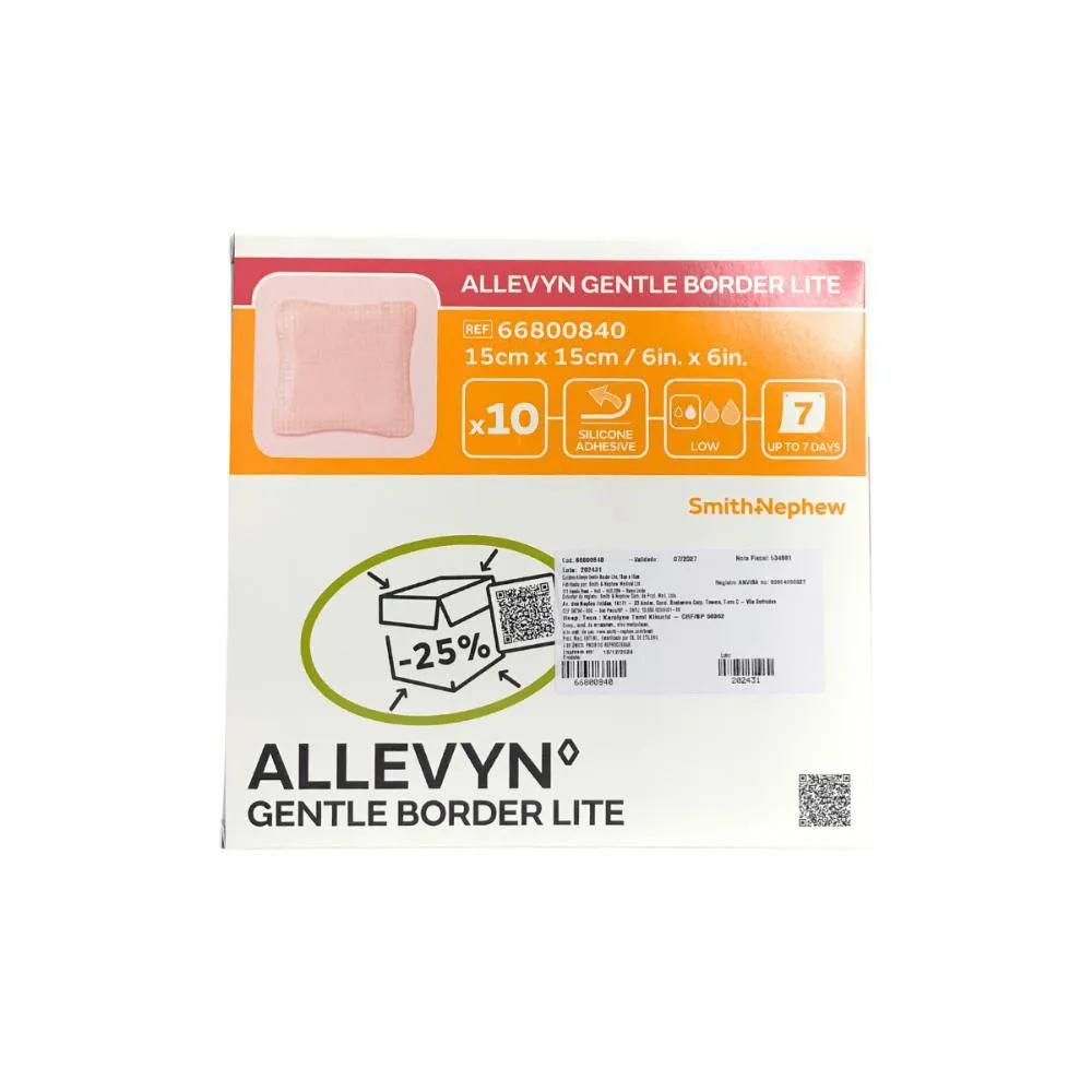 O Allevyn Gentle Border Lite 15 × 15 cm da Smith & Nephew é um curativo de espuma com borda adesiva de silicone macio, indicado para feridas com baixo a moderado exsudato. Desenvolvido com tecnologia multicamadas, proporciona absorção eficaz, mantém ambiente úmido controlado e reduz o risco de maceração da pele. Seu adesivo suave em silicone garante fixação segura, além de remoção atraumática, oferecendo mais conforto para pacientes, inclusive aqueles com pele sensível.