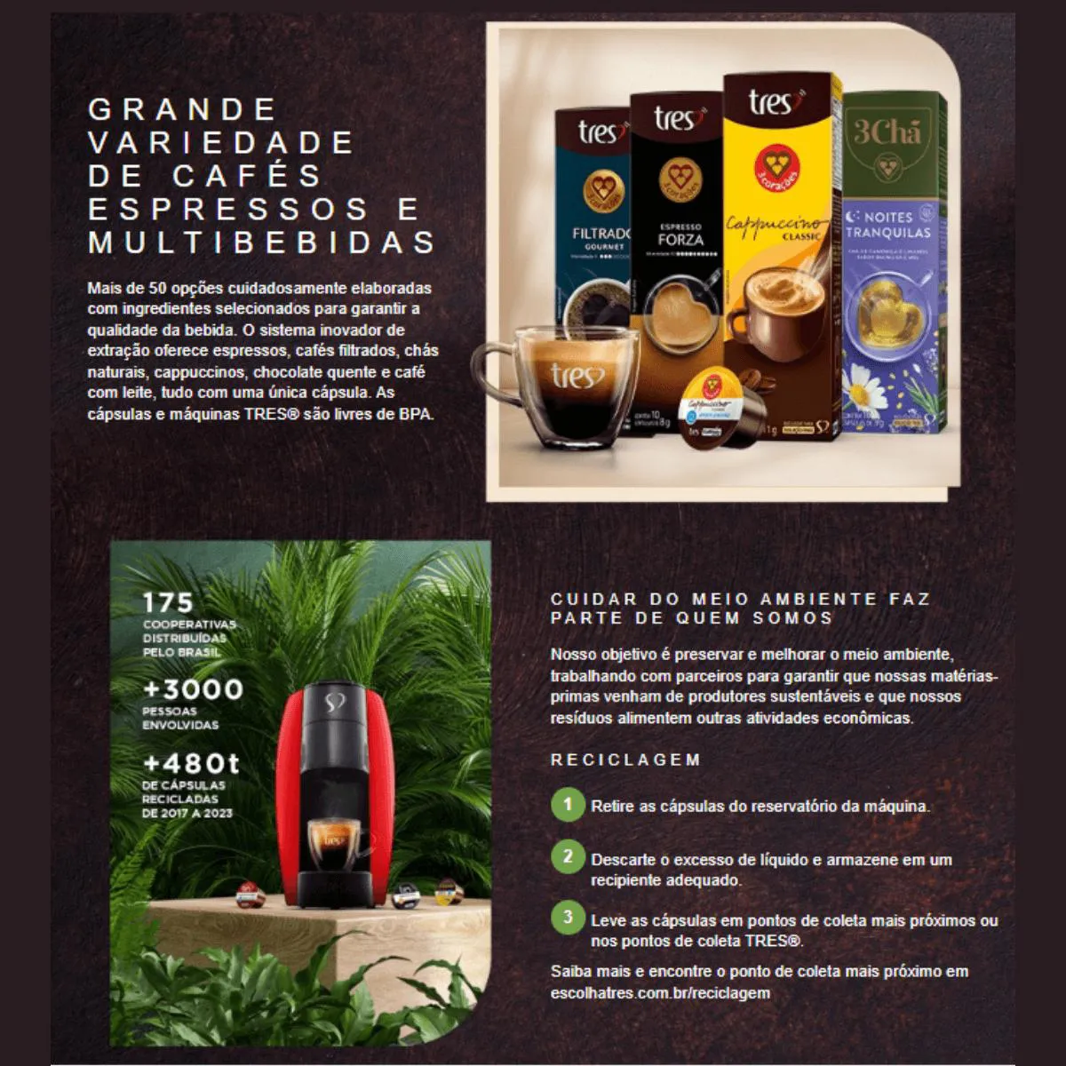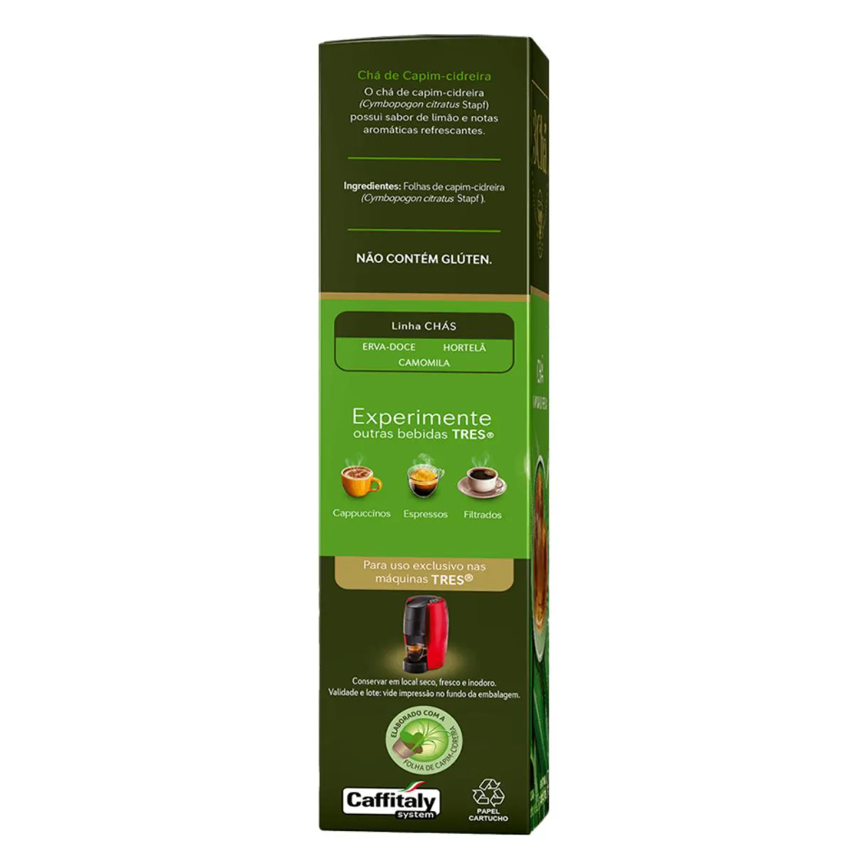 Modo de Preparo: Insira a cápsula na máquina TRES e pressione o botão verde para preparar 100ml de chá. Ingredientes: Folhas de Capim-Cidreira (Cymbopogon citratus Stapf). Informações Adicionais: 1 cápsula rende 100ml. As Cápsulas e Máquinas do sistema TRES® são livres de BPA. *Para uso exclusivo nas máquinas TRES®.