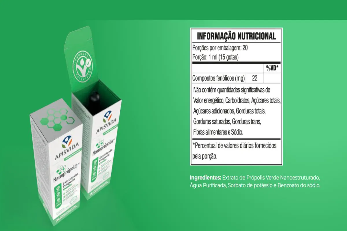 É um suplemento alimentar produzido com a autêntica própolis verde brasileira, uma resina produzida pelas abelhas partir da coleta da seiva da planta Alecrim-do-Campo (Baccharis dracunculifolia), constituída de ceras, óleos essenciais e mais de 200 compostos ativos. Seu processo envolve a produção de formulações nanoestruturadas de extrato de própolis em forma aquosa, resultando em uma nanoestrutura lipídica com própolis, através do encapsulamento dos compostos ativos.Inclusive, a própolis verde tem diversos compostos fenólicos e flavonoides, como o Artepelin-C e a Bacarina, que são os principais e exclusivos desse tipo de própolis. Os ativos ultrapassam com maior facilidade a barreira das células, resultando em uma melhor absorção e biodisponibilidade, superando os métodos convencionais.