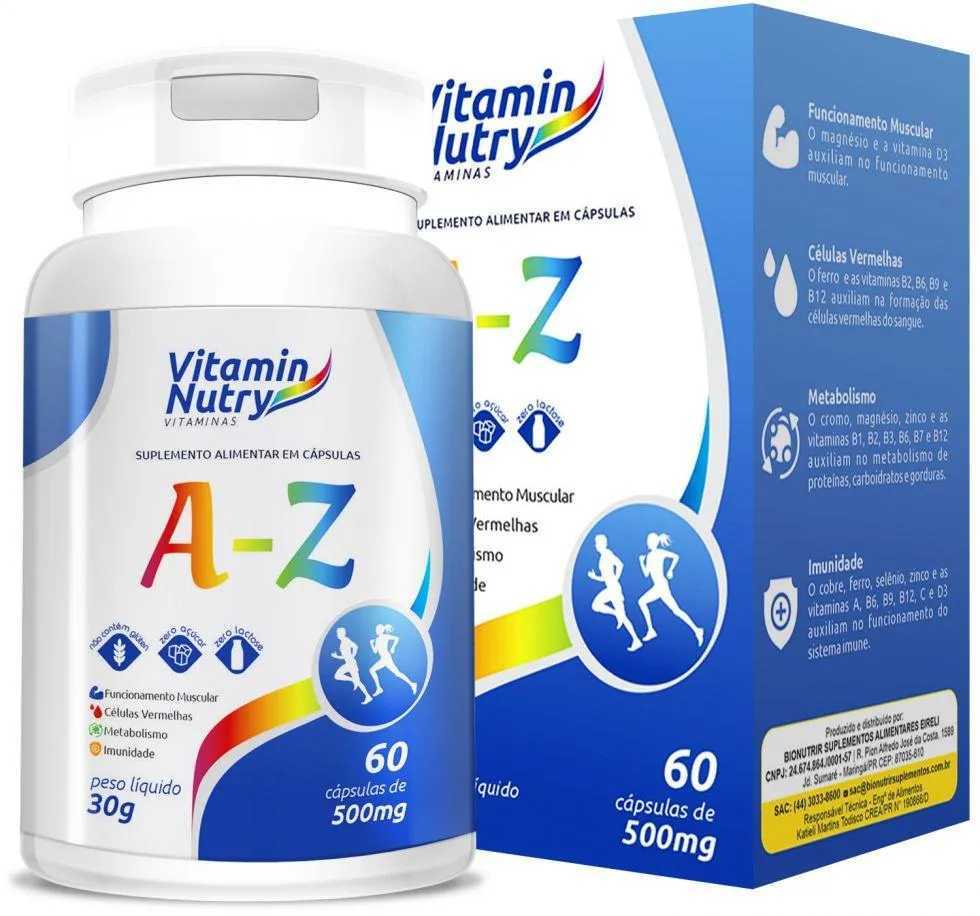 A-Z Multivitamínico 500mg (60 caps) - BioNutrir A linha Vitamin Nutry possui uma composição especial e completa para te fornecer oque há de melhor em quesito saúde. As cápsulas de A-Z Multivitamínico são essenciais para auxiliar no aumento da imunidade, fortalecimento muscular e acelerar o metabolismo. Sabemos que com uma boa alimentação, sono e consumo de água diariamente, é importante para se manter saudável e bem, mas com a A-Z Multivitamínico você pode auxiliar o seu corpo a se manter em equilíbrio mais facilmente. Vale lembrar que suplemento não substitui a rotina de uma boa alimentação, prática de exercícios, consumo adequado de água, exposição ao sol entre outros.Benefícios:* O Cromo, Magnésio, Zinco e as Vitaminas B1, B2, B3, B6, B7 e B12 auxiliam no metabolismo de proteínas, carboidratos e gorduras;* O Magnésio e a Vitamina D3 auxiliam no Funcionamento Muscular* O Cobre, Ferro, Selênio, Zinco e as Vitaminas A, B6, B9, B12, C e D3 auxiliam no funcionamento do sistema Imune;* O Ferro e as Vitaminas B2, B6, B9 e B12 auxiliam na formação das células vermelhas do sangue:* O Cobre, Selênio, o Zinco e as Vitaminas B2, C e E são antioxidante que auxiliam na proteção dos danos causados pelos radicais livres.