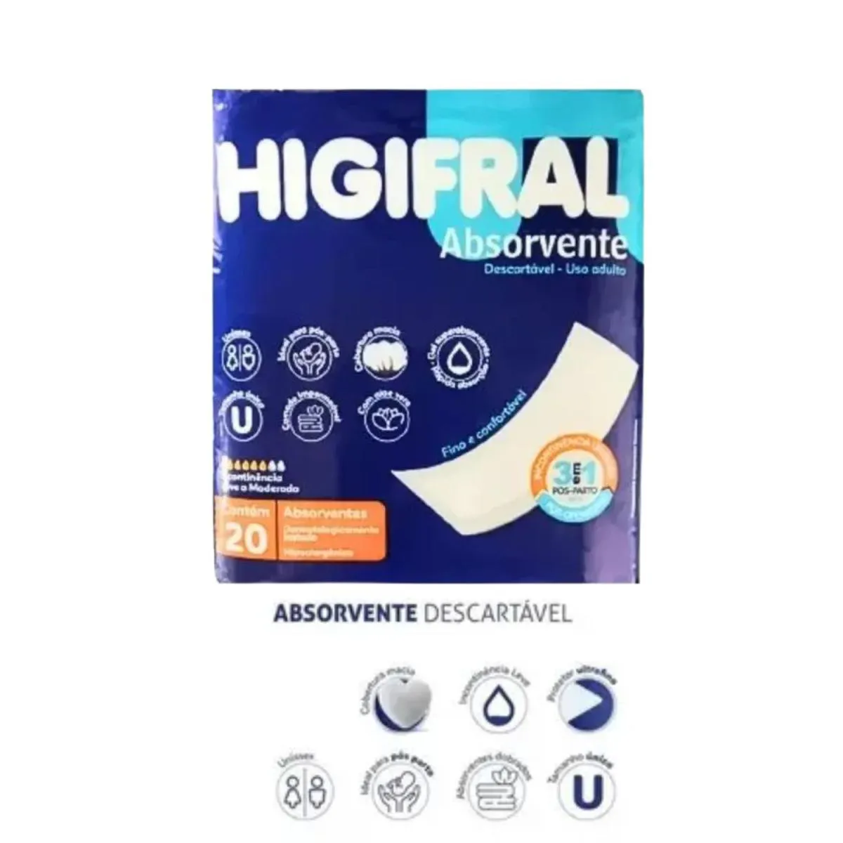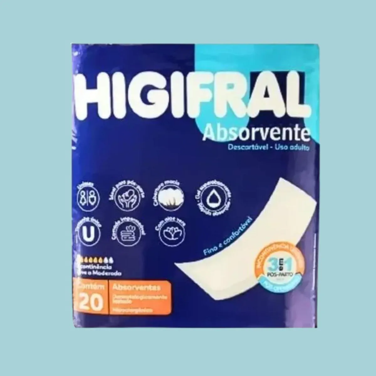 absorvente Geriátrico Pós-Parto Higifral C/20 Unidades O Absorvente Pós-Parto Higifral foi desenvolvido especialmente para oferecer conforto e segurança durante o período pós-parto ou em casos de incontinência leve. Sua tecnologia de absorção rápida e barreiras antivazamento garantem proteção prolongada e sensação de pele seca por mais tempo. Diferenciais: