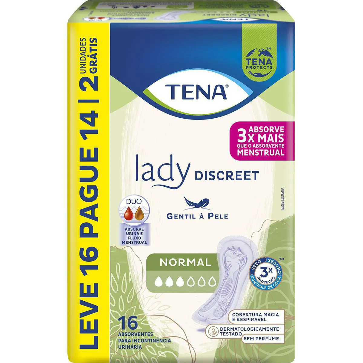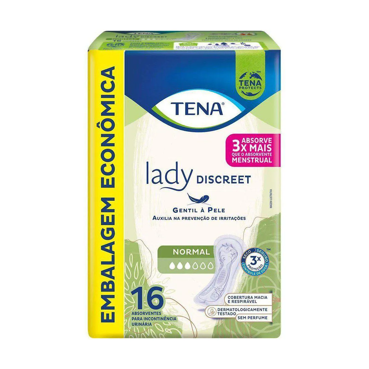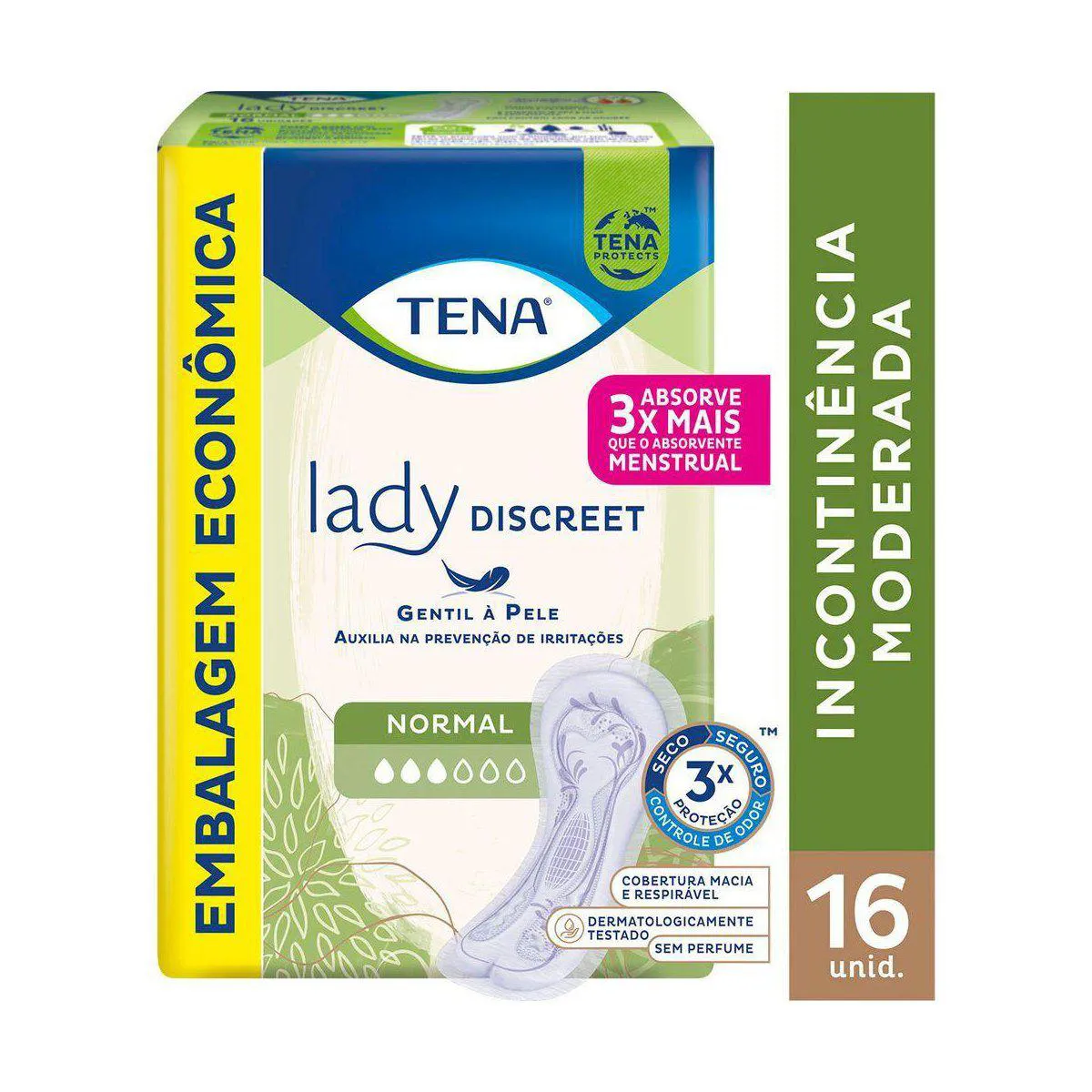 O Tena Lady Discreet Normal é um absorvente íntimo feminino que, diferente dos convencionais, pode ser usado não só em casos de incontinência urinária, mas, também, durante o fluxo menstrual, oferecendo proteção e conforto no dia a dia.
