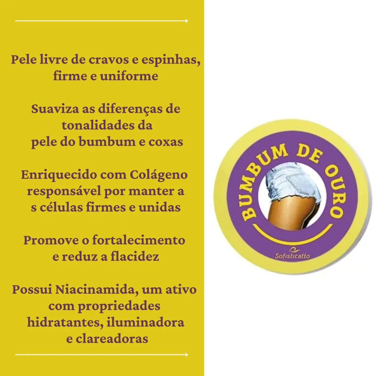 BumBum de Ouro é um creme firmador e uniformizador da pele, que suaviza as diferenças de tonalidades da pele do bumbum e coxas, deixando-a iluminada e uniforme. Ele é enriquecido com colágeno que é uma proteína responsável por manter as células firmes e unidas, promovendo o fortalecimento e reduzindo a flacidez. A Niacinamida é um ativo com propriedades hidratantes, iluminadora e clareadora. O Extrato de pêssego que é rico em aminoácidos, vitamina a e C, sais minerais e glicídios como a frutose, glicose e sacarose, que dão a este ingrediente propriedades remineralizantes e hidratantes. O Ácido Salicílico ajuda a controlar a oleosidade, esfoliar a camada superficial da pele e melhorar o aspecto de cravos e espinhas.