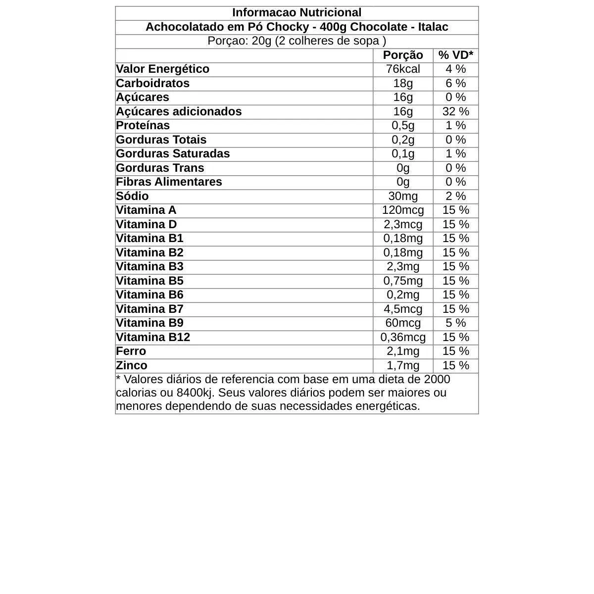 Açúcar, cacau em pó, maltodextrina, sal, vitaminas [vitamina a (acetato de retinol), vitamina d (colecalciferol), vitamina B9 (ácido N-pteroil-L-glutâmico), vitamina B5 (D-pantotenato de cálcio), vitamina B7 (D-biotina), vitamina B3 (nicotinamida), vitamina B1 (tiamina mononitrato), vitamina B12 (cianocobalamina), vitamina B2 (riboflavina) e vitamina B6 (cloridrato de piridoxina)], minerais [ferro (pirofosfato de ferro) e zinco (sulfato de zinco)], emulsificante lecitina de soja e aromatizante.