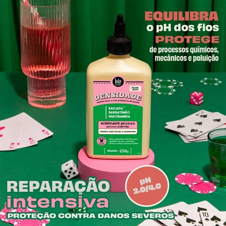 Acidificante Densidade Lola 250g: Cabelos finos e com problemas de queda. Ação reparadora intensiva para equilíbrio do pH e proteção contra os danos severos da fibra. Acidificante com pH 3.0/4.0 - Reparo intensivo e proteção contra os danos severos dos cabelos. Melhora a resistência dos cabelos, alinha e suaviza as cutículas e auxilia a prevenir a quebra e queda. Formulado especificamente para equilibrar o pH dos fios e proteger contra os danos dos processos químicos, ferramentas de modelagem, poluição e metais pesados da água. NIACINAMIDA fortalece o folículo capilar para prevenir a perda de densidade. Atua no centro do desequilíbrio do couro cabeludo, restaurando a sua barreira protetora. Melhora a elasticidade e força. BAICAPIL™ combinação sinérgica de ativos botânicos, aprovados clinicamente. Crescimento de fios mais saudáveis e mais fortes, aumenta a densidade, reduz a queda e devolve a aparência mais jovem e saudável dos cabelos. BARBATIMÃO com propriedades anti-inflamatórias e calmantes. Ideal para a saúde do couro cabeludo, aumenta a resistência e evita a quebra e a queda dos fios. Como usar: Após higienizar os cabelos preferencialmente com o shampoo Densidade, retire o excesso de água e distribua uma quantidade generosa do Acidificante nos cabelos úmidos. Terapie gentilmente desde a raiz até as pontas. Deixe agir por até 5 minutos. Enxágue abundantemente. Para potencializar os resultados siga com a Máscara Densidade. #FicaDica: Uso recomendado conforme a necessidade dos cabelos.