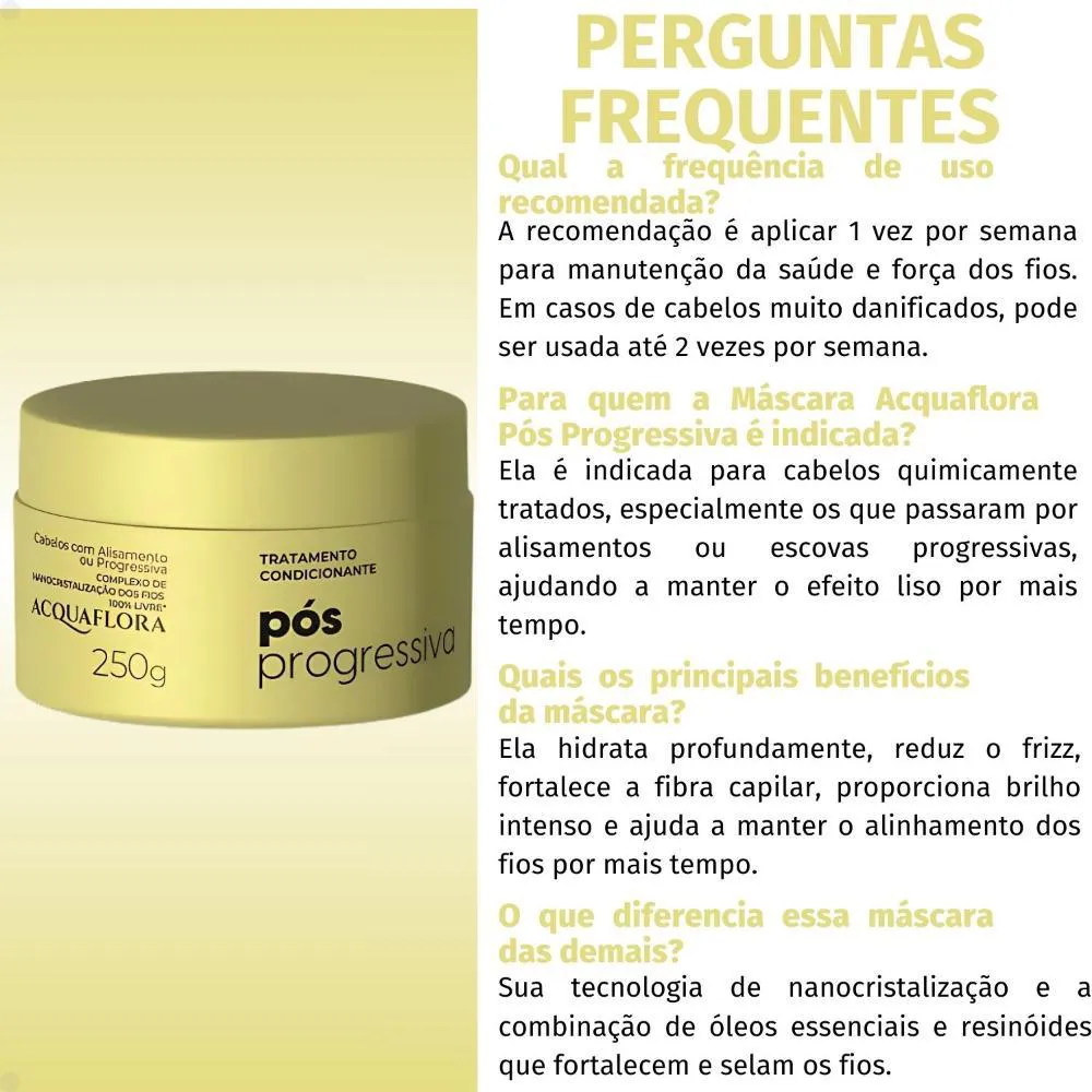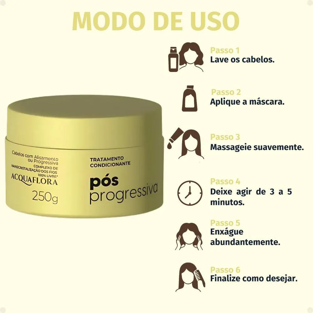 Após lavar os cabelos com shampoo (preferencialmente o Shampoo Acquaflora Pós Progressiva), aplique a máscara nos fios limpos e úmidos, cobrindo toda a extensão.Massageie suavemente para garantir a penetração do produto nos fios e alcance da raiz.Deixe agir de 3 a 5 minutos para uma absorção eficaz dos nutrientes.Enxágue bem e abundantemente para garantir que não restem resíduos, deixando os cabelos sedosos.Recomenda-se a aplicação de 1 a 2 vezes por semana para melhores resultados.Características Técnicas e Especificações Essenciais