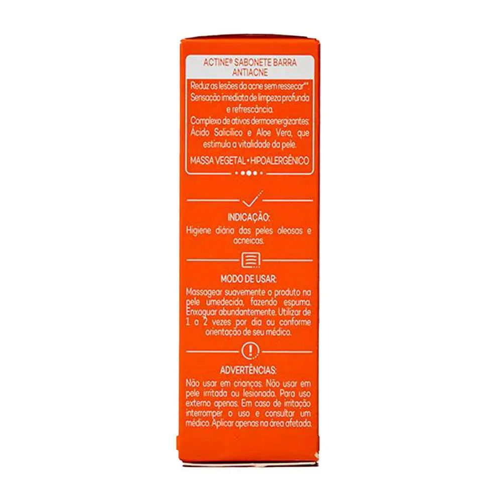 O Actine Sabonete Barra é um produto para realizar uma limpeza profunda diária da pele oleosa e acneica, sem danificar ou deixar a pele da face ressecada ou repuxando. O controle eficaz da oleosidade é possível graças ao PCA de Zinco.