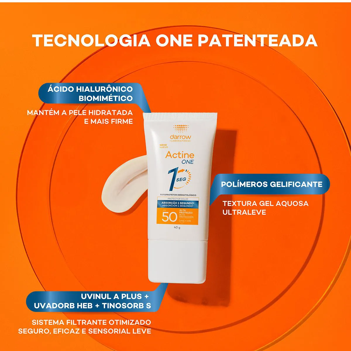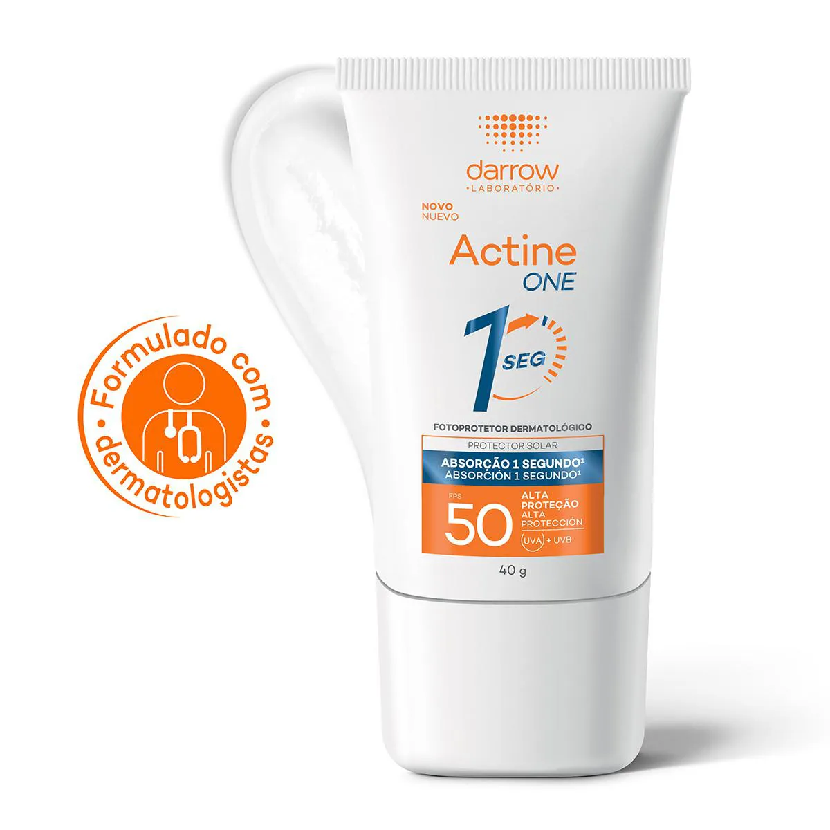 Actine One FPS50 é um protetor solar facial da Darrow, com absorção em 1 segundo, acabamento invisível em todos os fototipos e alta proteção UVA+UVB (FPS50). Ideal para peles oleosas, ele oferece 12 horas de controle antioleosidade e textura 2x mais leve e refrescante.