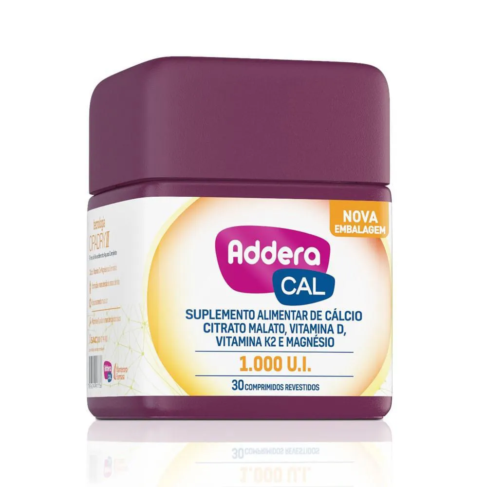 "Comprar Addera +Cal 1000UI c/30 Comprimidos. Confira aqui os melhores preços, condições, ofertas e promoções! Receba em sua casa com confiança e segurança.Addera +Cal 1000UI c/30 Comprimidos - Suplemento alimentar de cálcio citrato malato, vitamina d, vitamina K2 e magnésio.Modo de usar1 comprimido ao dia ou de acordo com recomendação do médico e/ou nutricionista. Deve ser conservado em local seco, fresco e ao abrigo da luz, abaixo de 25°C.
