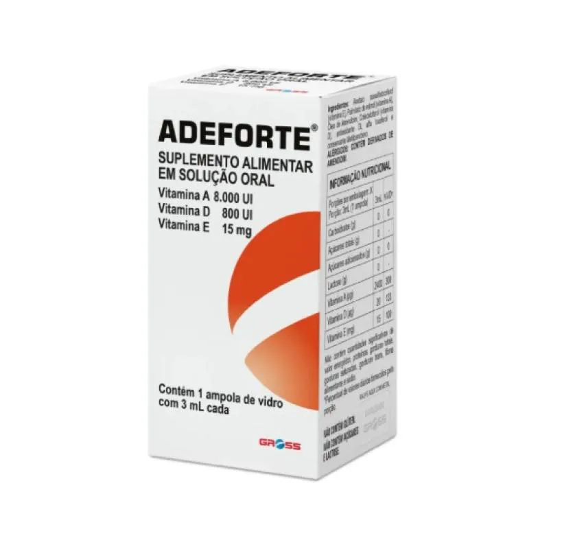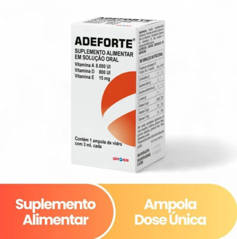 O Adeforte 8.00 UI ampola é um suplemento polivitamínico de uso oral, indicado para a prevenção e tratamento das deficiências das vitaminas A, D e E. Sua fórmula concentrada é ideal para crianças e adultos que necessitam de reposição vitamínica, contribuindo para o fortalecimento do sistema imunológico, saúde da visão, ossos e função antioxidante do organismo. Benefícios do Adeforte Reposição eficaz das vitaminas A, D e E Auxilia na saúde ocular, óssea e imunológica Ação antioxidante que combate os radicais livres Fácil administração oralem dose única Indicado para adultos e crianças.