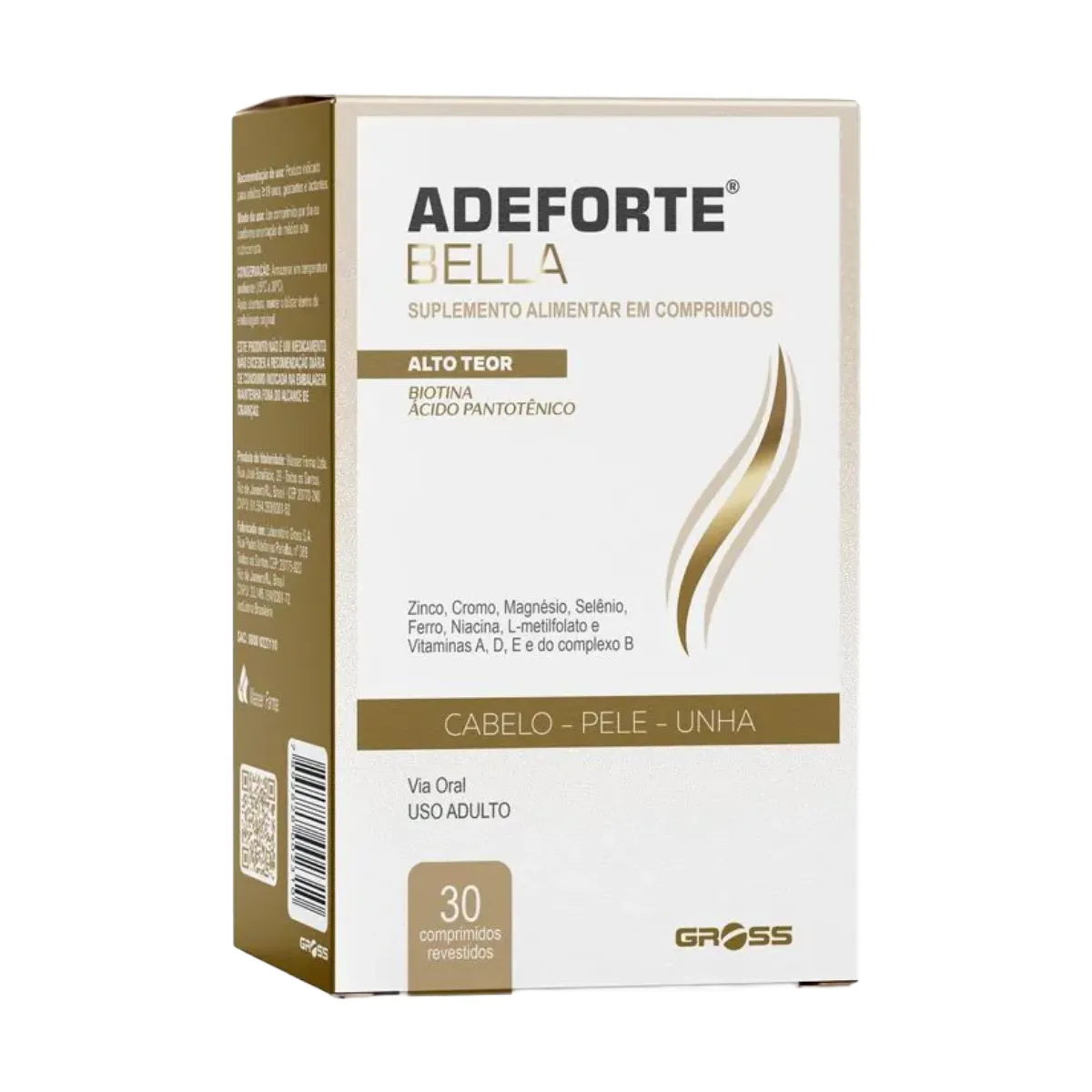 O Suplemento Alimentar Adeforte Bella Cabelo, Pele e Unha é um suplemento vitamínico desenvolvido para adultos maiores de 19 anos, incluindo gestantes e lactantes. Sua fórmula contém Biotina, ácido pantotênico, cromo, vitamina B12, ácido fólico, vitamina B1 e vitamina e, que atuam na manutenção da saúde dos cabelos, da pele e das unhas, além de oferecer proteção antioxidante e suporte ao sistema imunológico e à saúde muscular.