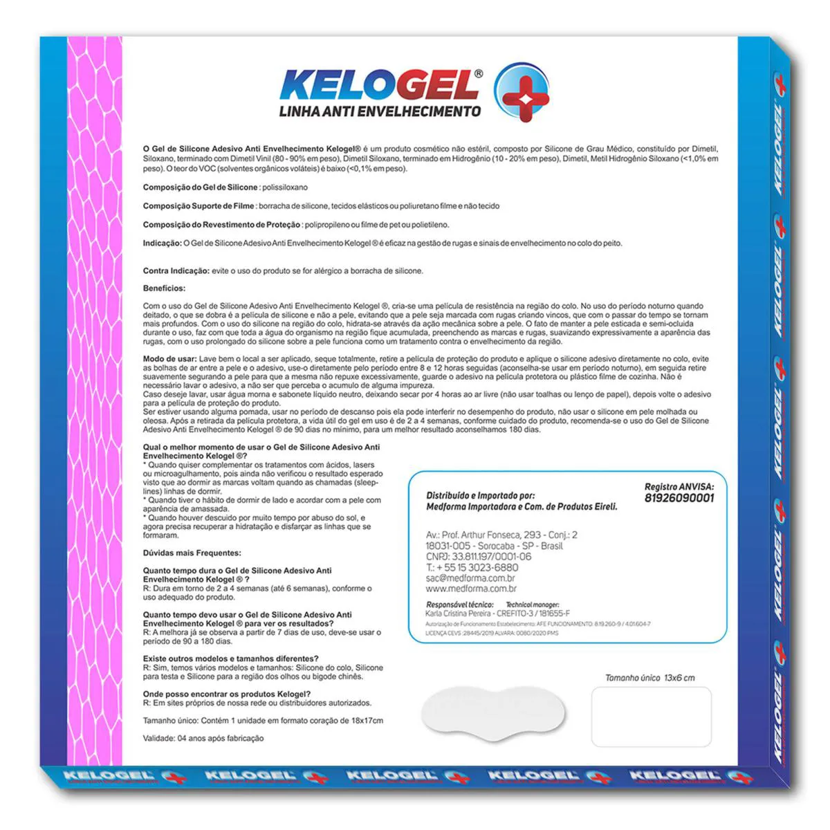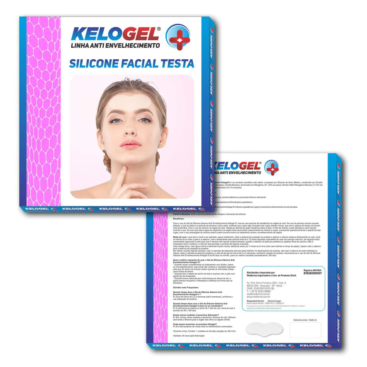 Indicação: O Gel de Silicone Adesivo Antienvelhecimento Kelogel® evita que a pele seja marcada com rugas, que se tornam mais profundas com o tempo. Usado no colo, olhos, bigode chinês ou testa, hidrata a pele através da ação mecânica do silicone. Mantendo a pele esticada, a água do organismo acumula na região, preenchendo e suavizando marcas e rugas, funcionando como tratamento antienvelhecimento. Modo de uso: Limpe e sanitize a pele onde será aplicado, sem usar pomada, creme e afins. Seque a área, retire a película protetora e aplique o lado colante na região, evitando bolhas de ar. Use por 8 a 12 horas seguidas (preferencialmente à noite). Retire suavemente segurando a pele para evitar repuxar. Guarde o adesivo na película protetora ou plástico filme. Não é necessário lavar o adesivo, exceto se houver acúmulo de impurezas. Se necessário, lave com água morna e sabonete neutro, secar ao ar livre por 4 horas antes de voltar o adesivo para a película de proteção. Contraindicação: Não use se for alérgico a silicone. Não utilize em pele lesionada ou irritada. Conservação: A vida útil do gel em uso é de 10 a 25 dias. O gel permanece eficiente mesmo após perder a adesividade. Recomenda-se o uso com micropore para comprimir a área tratada. Para melhores resultados, use por no mínimo 90 dias, aconselhando-se 180 dias. REGISTRO ANVISA: 81926090001