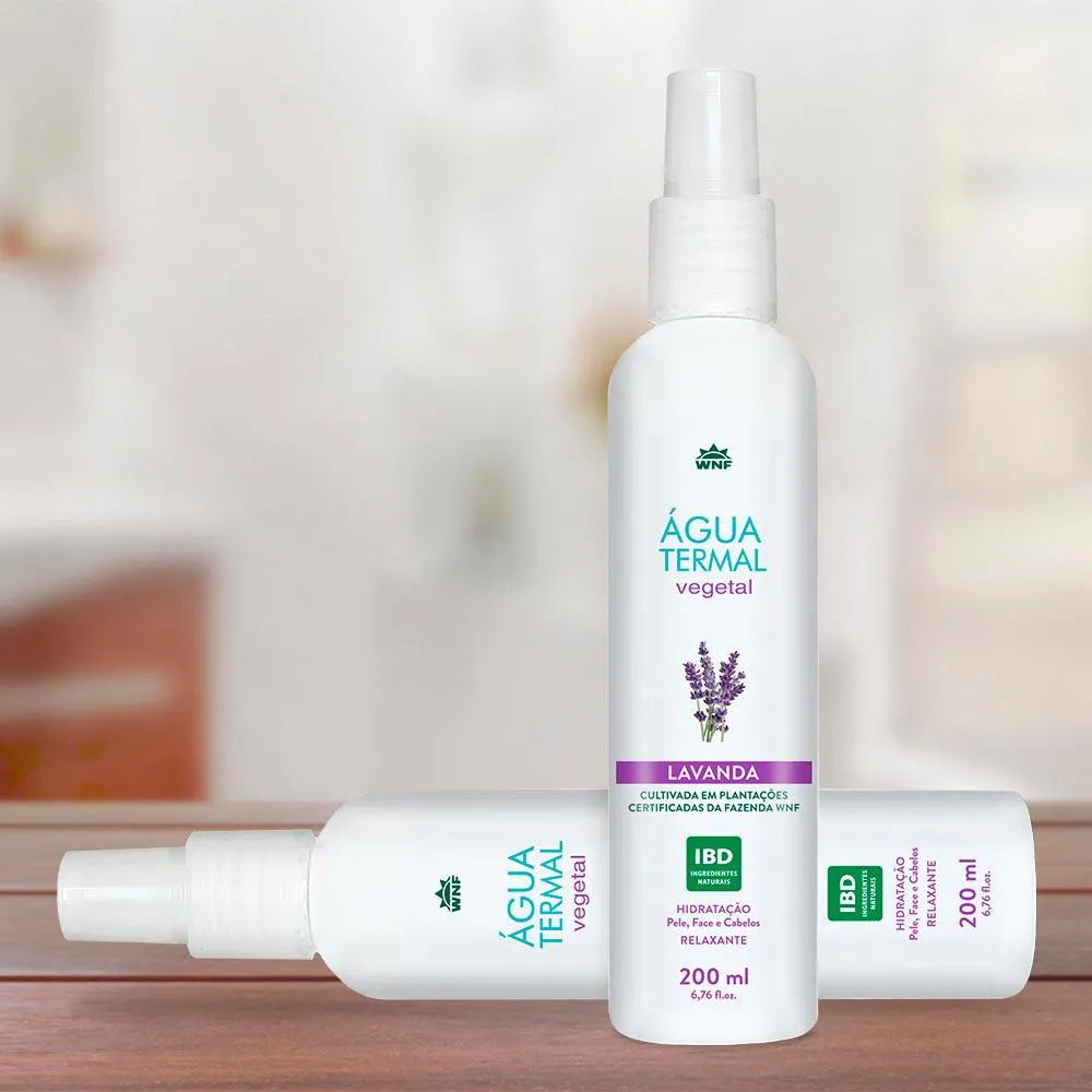 A Água Termal Vegetal de Lavanda WNF é rica em sais minerais de origem vegetal como o Zinco, Magnésio, Potássio, Cálcio, Sódio, Ferro, Enxofre, Telúrio, Fósforo e Silício. Hidrata, nutre, acalma e equilibra a pele, tem efeito relaxante, tônico e refrescante. É emoliente, alivia sinais de expressão, tensão e estresse. Usada nos tratamentos de peles que sofrem com o estresse emocional, esgotamento físico e mental. Hipoalergênica, é excelente para peles sensíveis. Nos cabelos, hidrata e diminui o frizz.