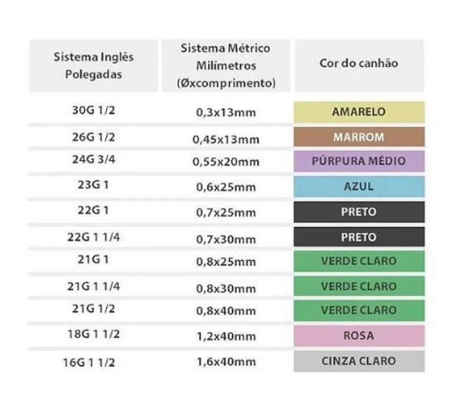- Canhão colorido que facilita a identificação visual do calibre da agulha;