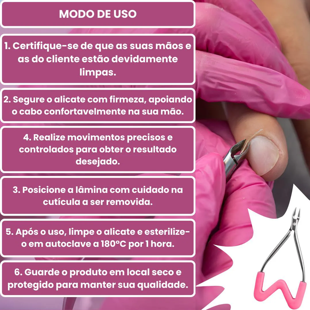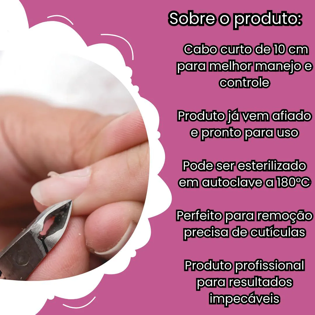ALICATE PERFEITO PARA CUTÍCULAS IMACULADAS E PRÁTICAS! Apresentamos o Alicate para Cutículas Delicate, a ferramenta profissional definitiva para quem exige precisão e durabilidade. Produzido em aço inoxidável cirúrgico de altíssima qualidade e forjado para maior resistência, este alicate é robusto e extremamente durável, garantindo um investimento que perdura. Sua lâmina super afiada, com fio de corte preciso, proporciona um resultado limpo e perfeito, permitindo um uso muito mais prolongado entre uma afiação e outra, o que significa praticidade e economia para você. O design inteligente conta com o exclusivo sistema de mola M, que oferece um conforto incomparável durante o manuseio, reduzindo a fadiga na sua mão e garantindo movimentos mais suaves e controlados. Seu cabo curto de 10 cm foi pensado para dar máximo controle e precisão em cada movimento, tornando a remoção das cutículas uma tarefa fácil e delicada para suas mãos e unhas. Perfeito para uso profissional ou em casa, ele já vem afiado e pronto para usar, e ainda pode ser esterilizado em autoclave a 180°C, assegurando total higiene e segurança em todos os procedimentos. Alcance cutículas incríveis com um produto de altíssima performance. "O fio dura uma eternidade, nao preciso afiar toda hora, amei demaisss" ~Camila P.