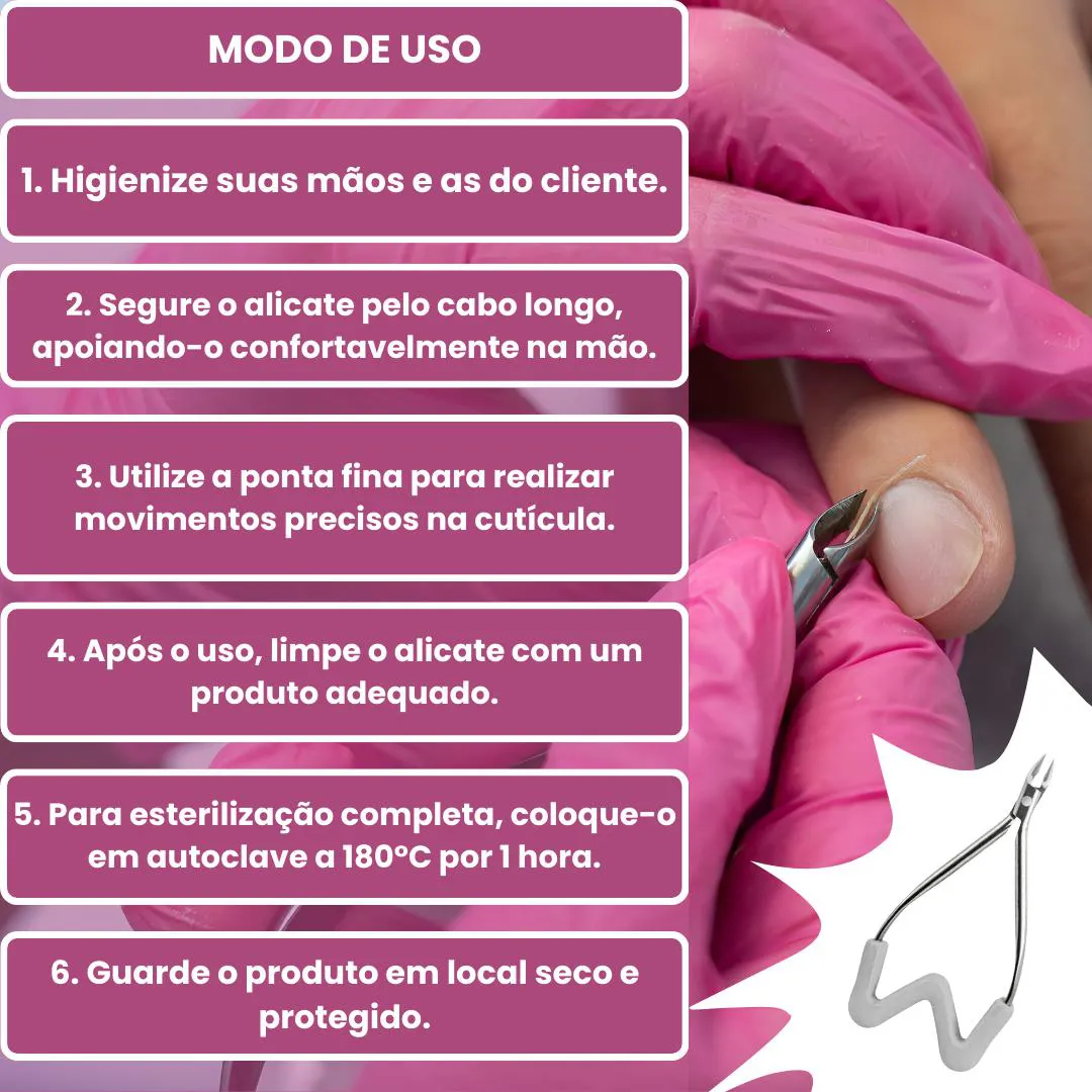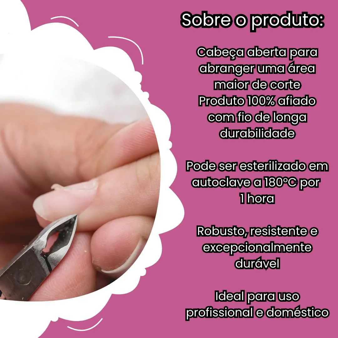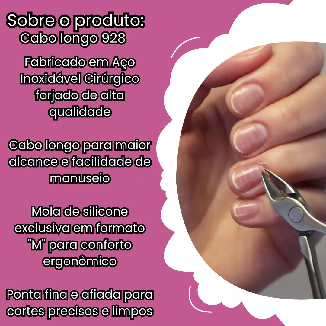 PRECISÃO E ALCANCE SUPERIORES PARA SUAS CUTÍCULAS! Eleve o nível do seu cuidado com as unhas com o Alicate para Cutículas Delicate Cabo Longo, a ferramenta definitiva para quem busca resultados profissionais com máximo conforto e higiene. Produzido em aço inoxidável cirúrgico forjado, este alicate é a personificação da robustez e durabilidade, garantindo um investimento que resiste ao tempo e ao uso intenso. Seu design inovador conta com um cabo alongado que oferece um alcance superior e um manejo facilitado, permitindo acessar até as áreas mais difíceis com incrível facilidade e controle total. A exclusiva mola de silicone em formato "M" garante um conforto ergonômico incomparável, reduzindo significativamente a fadiga na sua mão durante o uso e proporcionando movimentos suaves e precisos. A ponta fina e ultra-afiada, 100% pronta para uso, assegura cortes limpos e impecáveis desde a primeira utilização, graças ao seu fio de longa duração. Com a cabeça aberta, ele abrange uma área maior de corte, tornando o processo mais eficiente. Perfeito para profissionais e entusiastas, ele ainda pode ser esterilizado em autoclave a 180°C, garantindo a máxima assepsia e segurança em todos os procedimentos. "O cabo longo é tudoooo, alcancei tudinho sem forçar a mão, mt pratico msm" ~Beatriz S.