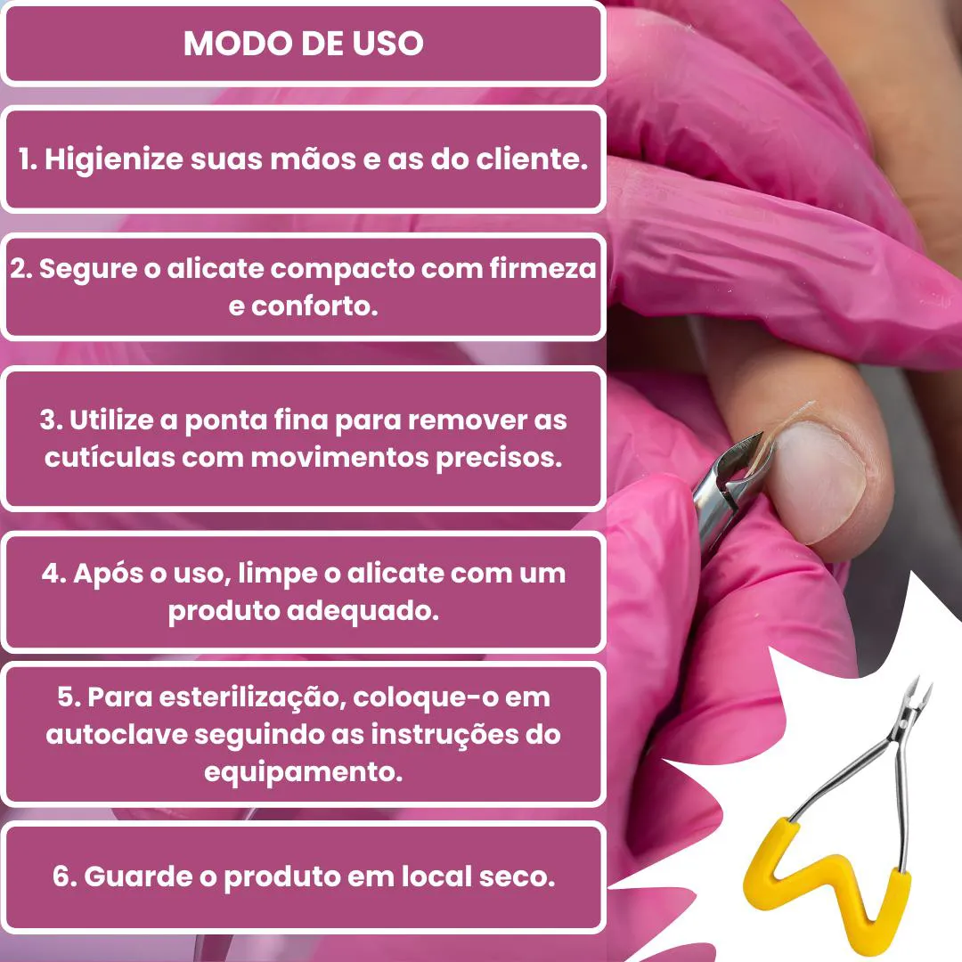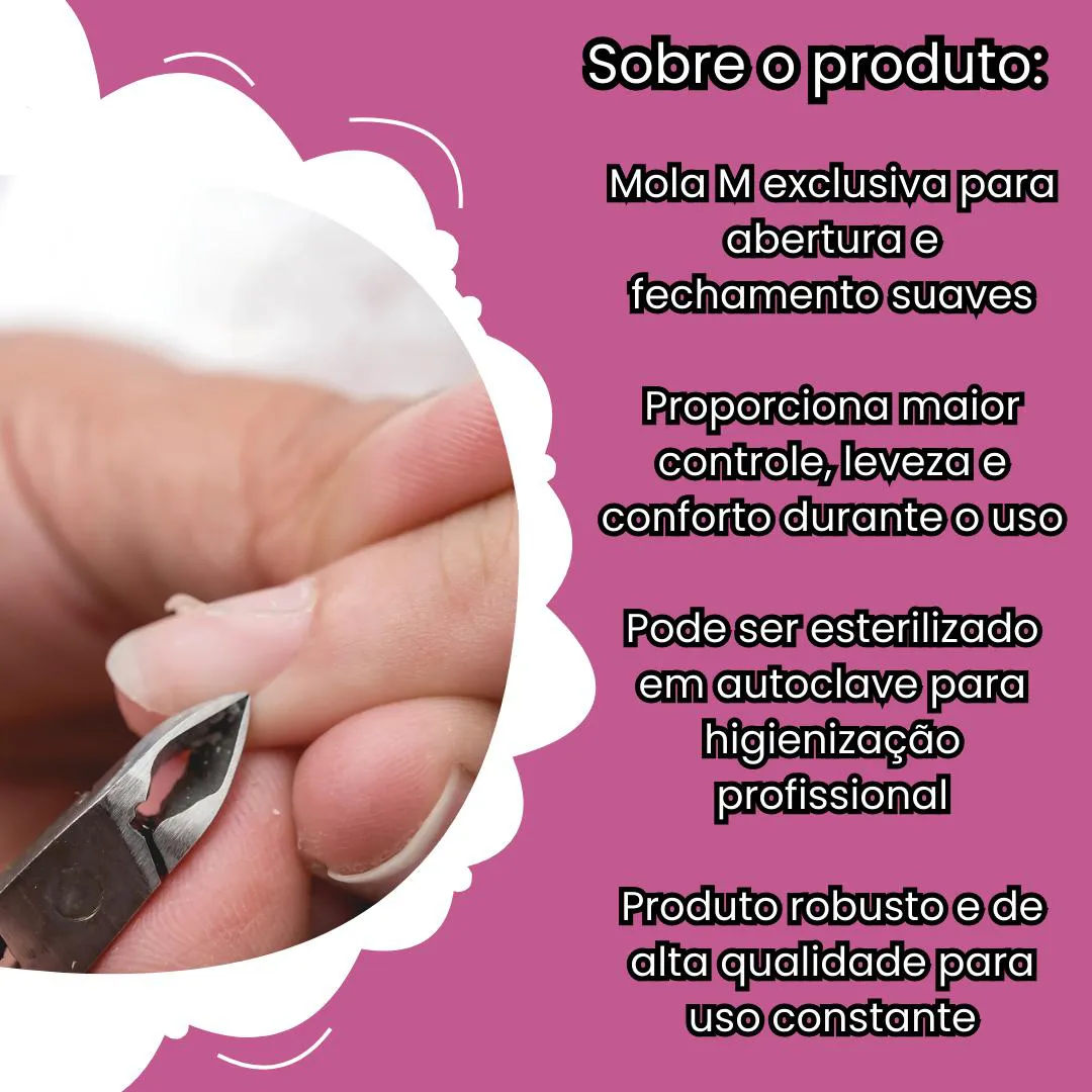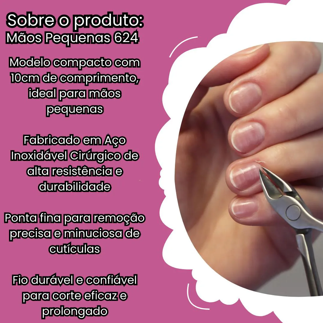 PRECISÃO PERFEITA PARA MÃOS PEQUENAS E MUITO CONFORTO! Conheça o Alicate para Cutículas Delicate com Mola M, a solução ergonômica e compacta desenvolvida especialmente para mãos pequenas que não abrem mão da precisão profissional! Com apenas 10cm de comprimento, este alicate oferece um controle absoluto e uma leveza incomparável, permitindo movimentos firmes e delicados para um acabamento impecável. Produzido em aço inoxidável cirúrgico da mais alta qualidade, ele é incrivelmente resistente e durável, garantindo um investimento inteligente para seu salão ou cuidado pessoal. A ponta fina e ultra-afiada foi projetada para uma remoção precisa e minuciosa das cutículas, alcançando até as áreas mais delicadas com facilidade e segurança. O fio durável e confiável garante um corte eficaz prolongado, ideal para uso constante sem perder o fio. A exclusiva Mola M proporciona uma abertura e fechamento suaves, facilitando o trabalho contínuo e reduzindo significativamente a fadiga na sua mão. Completo e seguro, ele pode ser esterilizado em autoclave, mantendo os mais altos padrões de higiene profissional. Experimente o conforto e o controle que só um instrumento projetado para o seu biotipo pode oferecer. "Finalmente um alicate do tamanho da minha mão, o controle é outro nivel, amei dms" ~Carolina P.