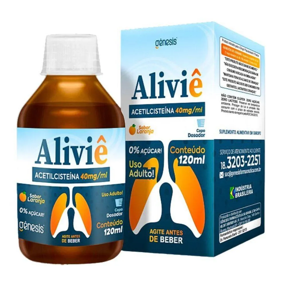 Aliviê Solução Oral 40mg ml Xarope com 120ml - Aliviê Solução Oral 20mg ml Xarope com 120ml é indicado para alivio casos de secreção densa e viscosa. Com sabor de laranja, é especialmente recomendado para condições como bronquite aguda, bronquite crônica e suas exacerbações, enfisema pulmonar, pneumonia, colapso ou atelectasia pulmonar, e mucoviscidose.