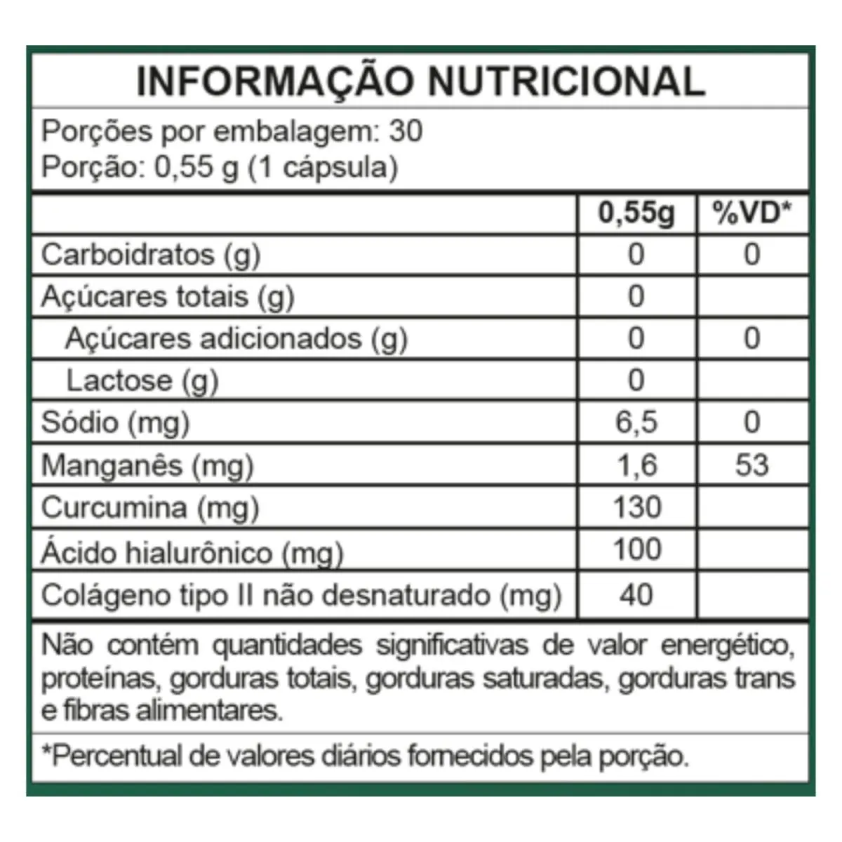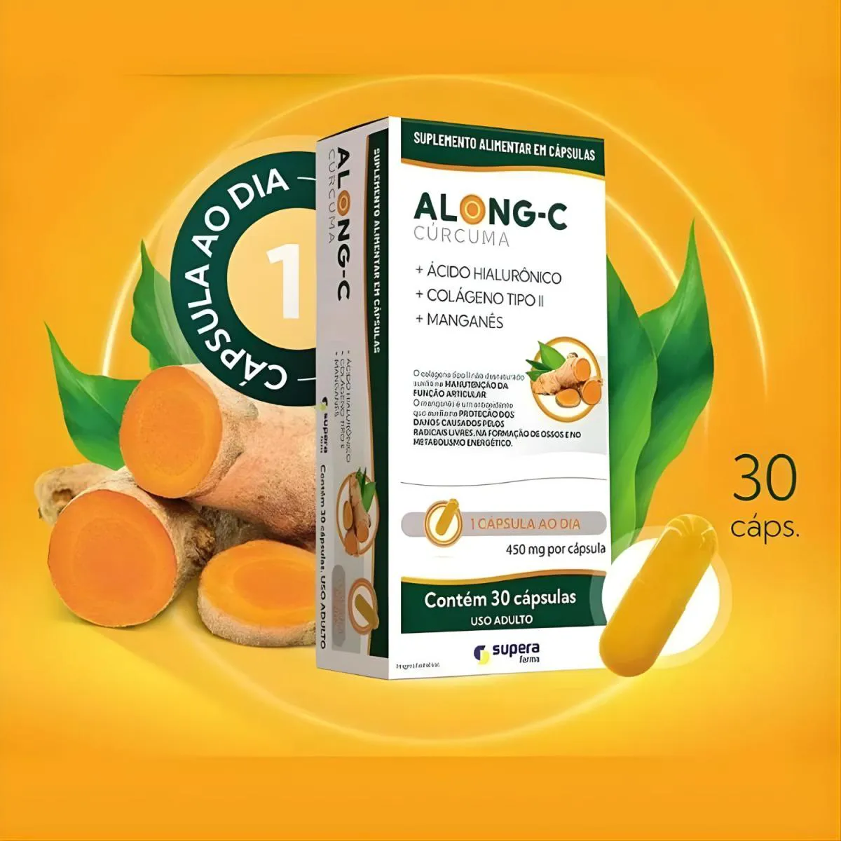Along C C30 Suporte Imunológico Diário Supera Farma Suplemento alimentar destinado a adultos que buscam suporte para a saúde das articulações, hidratação dos tecidos conectivos e mobilidade, oferecendo uma combinação de ingredientes como cúrcuma, ácido hialurônico, colágeno tipo II e manganês. Diferenciais: · Contém 130 mg de curcumina (derivado da cúrcuma), conhecido por propriedades anti-inflamatórias. · Inclui 100 mg de ácido hialurônico, substância que auxilia na lubrificação das articulações. · Possui 40 mg de colágeno tipo II não desnaturado, que contribui para a função articular e manutenção da cartilagem. · Contém 1,6 mg de manganês, mineral que participa da formação de ossos e tecidos conectivos, além de atuar como antioxidante. · Formulado para uso diário, com apenas 1 cápsula/dia — simplicidade e praticidade. Modo de uso: