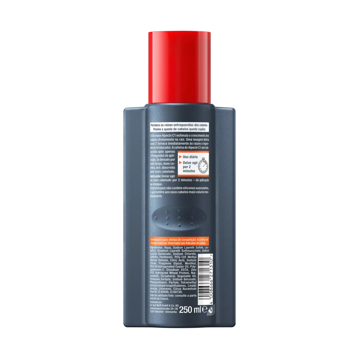 O Alpecin Caffeine Shampoo C1 é um shampoo antiqueda desenvolvido para homens, com fórmula exclusiva que ajuda a prevenir a queda de cabelo de origem hereditária. Sua ação começa já durante a lavagem, estimulando as raízes capilares com o complexo de cafeína, que permanece ativo por até 24 horas nos folículos.