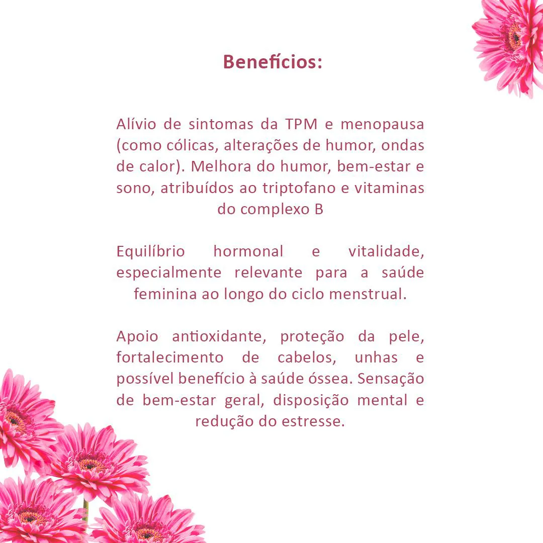 - Suporte à regulação do ciclo menstrual e funções reprodutivas femininas.
