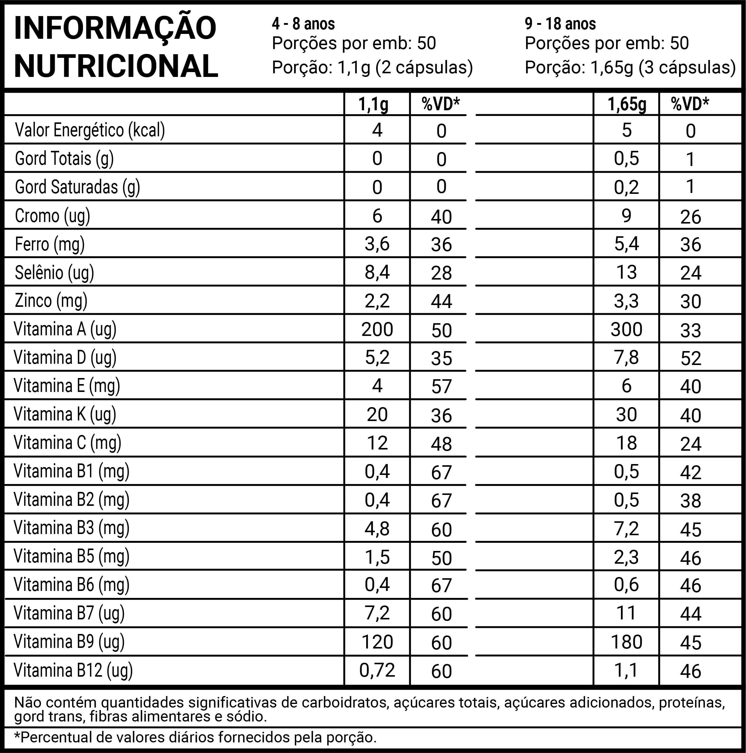 Óleo de semente de uva, óleo de coco, farinha de batata-doce, pirofosfato férrico, ascorbato de cálcio (vitamina c), bisglicinato de zinco, D-alfa-tocoferol (vitamina e), nicotinamida (vitamina B3), D-pantotenato de cálcio (vitamina B5), menaquinona-7 (vitamina K2), L-selenometionina, palmitato de retinol (vitamina a), nitrato de tiamina (vitamina B1), fosfato de piridoxal (vitamina B6), riboflavina-5’-fosfato de sódio (vitamina B2), L-metilfolato de cálcio (vitamina B9), picolinato de cromo, D-biotina (vitamina B7), colecalciferol (vitamina d), metilcobalamina (vitamina B12), estabilizante carbonato de cálcio, emulsificante lecitina de girassol, edulcorantes eritritol e glicosídeos de esteviol, acidulante ácido cítrico e aromas naturais e óleo essencial de laranja.