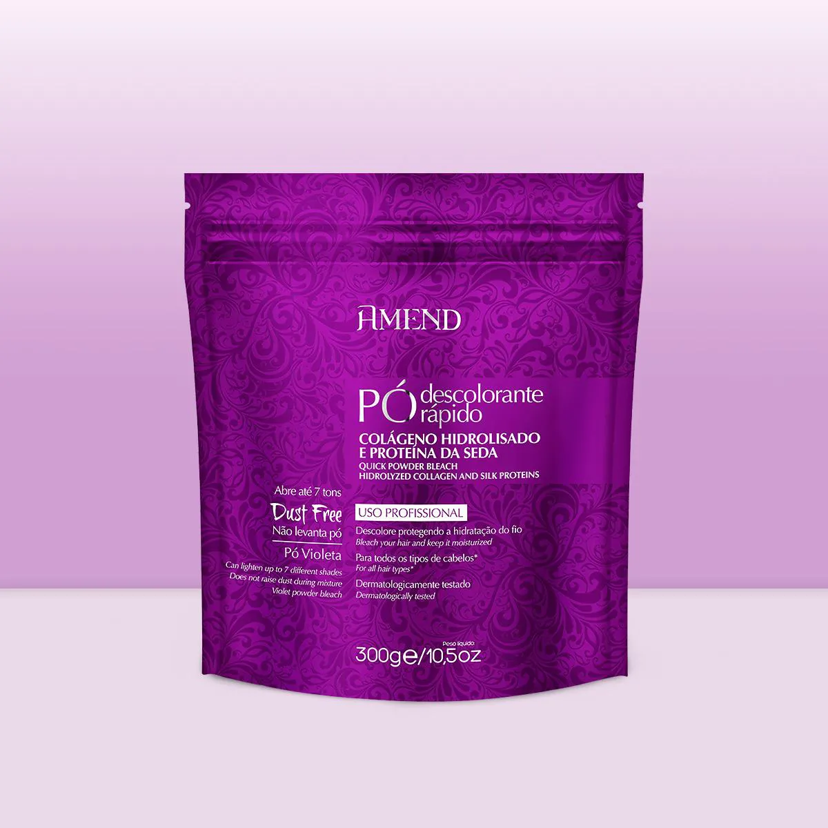 Misture com oxidante, na proporção recomendada pelo fabricante. Aplique a mistura no cabelo seco e não lavado, começando pelas pontas e trabalhando em direção às raízes. Deixe agir de acordo com o tempo de exposição recomendado e enxague abundantemente com água. Em seguida, lave o cabelo com shampoo. Amend Colágeno e Proteína da Seda - Clareamento Uniforme, Fios Protegidos e Brilho Intenso Proporciona o clareamento de até 7 tons com segurança e uniformidade. Enriquecido com colágeno e proteína da seda, preserva a hidratação e resistência dos fios durante a descoloração, deixando-os suaves e com brilho saudável.