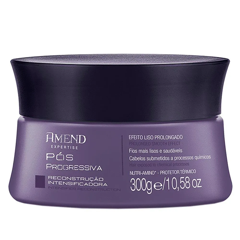 Máscara Reconstrutora Intensificadora Pós Progressiva Amend - Atua nas camadas mais profundas da fibra capilar. Com Nutri-Amino, repõe os aminoácidos perdidos durante o processo de escova e resgata a resistência e força. Promove brilho, maciez e movimento natural aos fios.