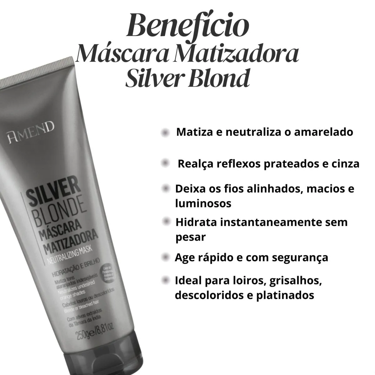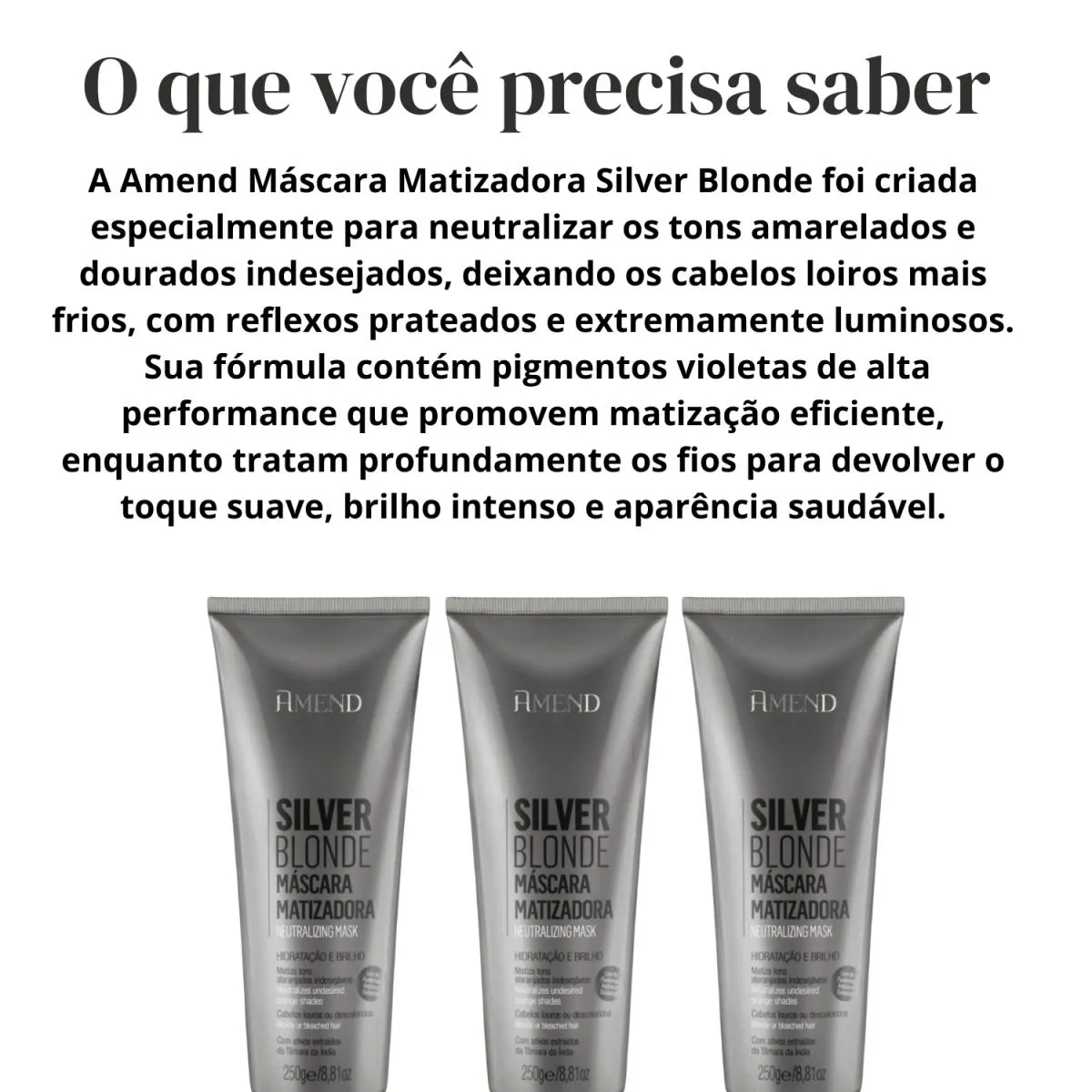 A Máscara Matizadora Amend Silver Blonde 250g foi desenvolvida exatamente para esse momento: matizar imediatamente, neutralizando reflexos indesejáveis e devolvendo ao cabelo um tom mais frio, uniforme e luminoso.