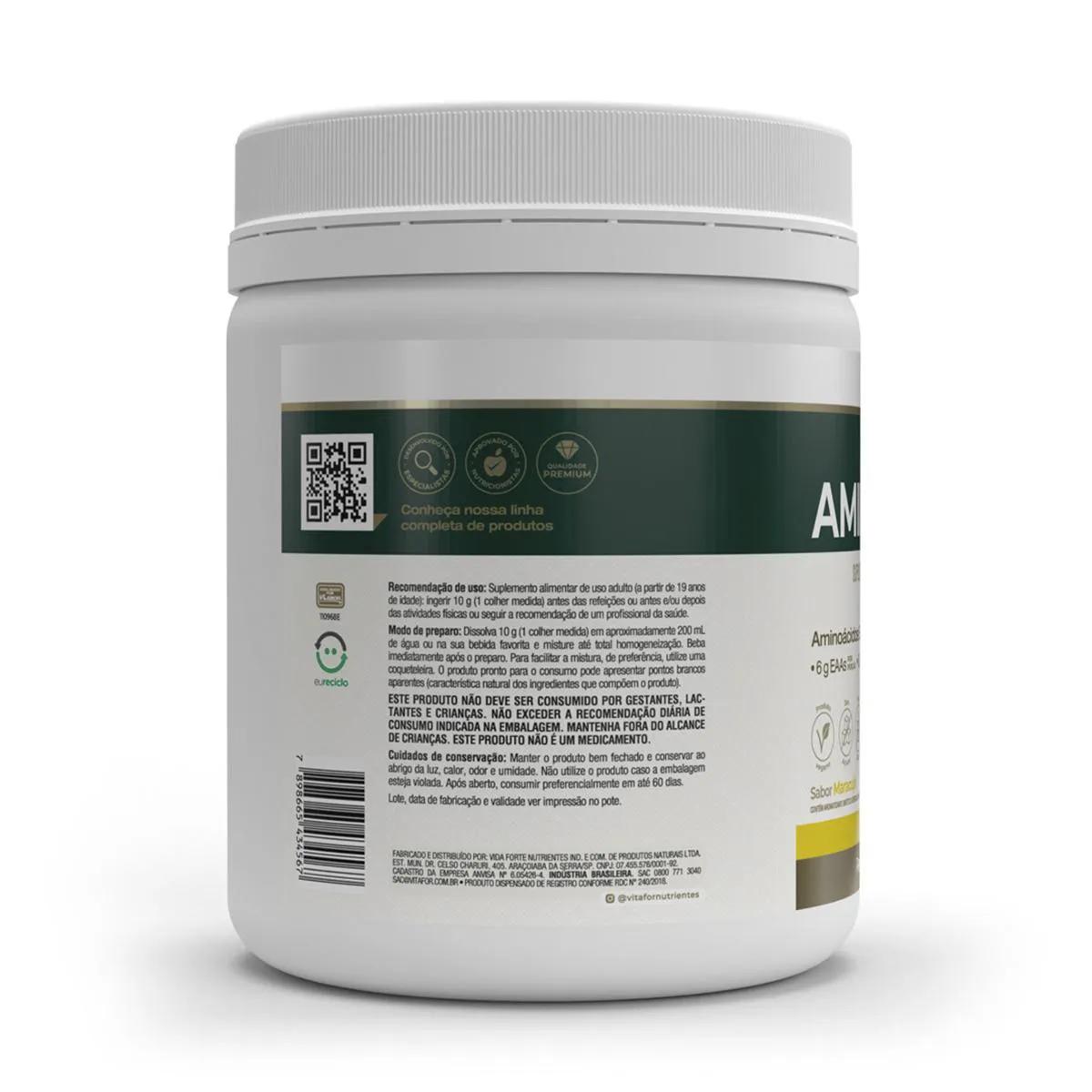 - Selo de qualidade VLabor. Recomendação de uso: Suplemento alimentar de uso adulto (a partir de 19 anos de idade): ingerir 10 g (1 colher medida) antes das refeições ou antes e/ou depois das atividades físicas ou seguir a recomendação de um profissional da saúde. Modo de uso: Dissolva 10 g (1 colher medida ou 1 sachê) em aproximadamente 200 ml de água ou na sua bebida favorita e misture até total homogeneização. Beba imediatamente após o preparo. Para facilitar a mistura, de preferência, utilize uma coqueteleira. O produto pronto para o consumo pode apresentar pontos brancos aparentes (característica natural dos ingredientes que compõem o produto). Ingredientes: Sabor Maracujá: Leucina, valina, isoleucina, cloridrato de lisina, trealose, fenilalanina, treonina, metionina, L-triptofano, cloridrato de L-histidina, edulcorantes xilitol, glicosídeos de esteviol, taumatina, aroma idêntico ao natural de maracujá, acidulante ácido cítrico, antiumectante dióxido de silício, espessante goma xantana, regulador de acidez fosfato tricálcico e corante curcuma. Cuidados e conservação: - Manter o produto ao abrigo da luz, calor, odor e umidade.