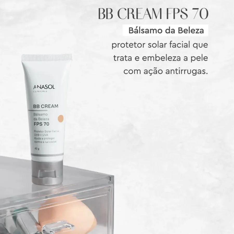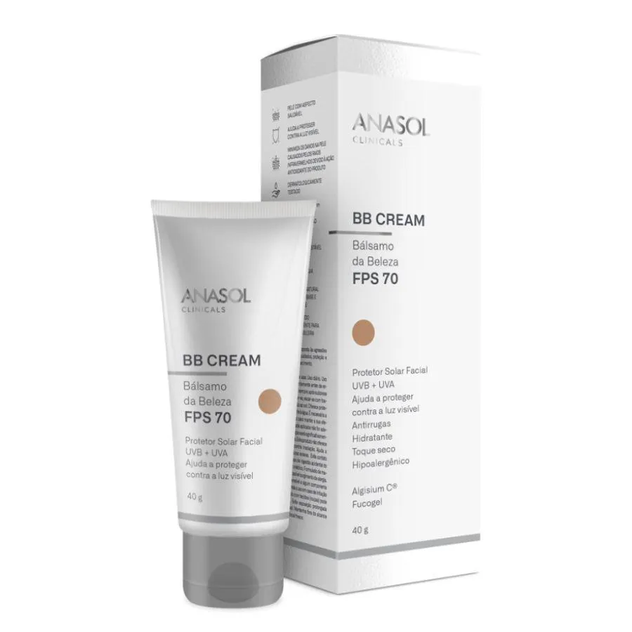 Anasol Clinicals BB Cream FPS 70 trata e embeleza a pele, por meio de ativo tecnológico com ação antirrugas que atua sobre a biossíntese do colágeno. Além disso, conta com pigmento inteligente que se adapta naturalmente ao tom da pele.