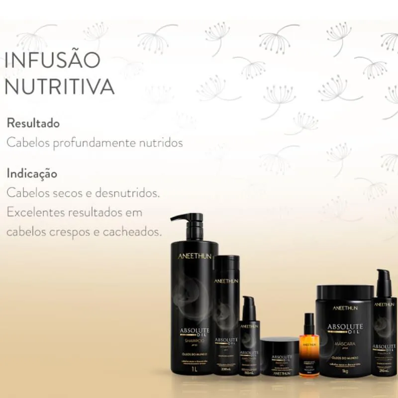 Aneethun Absolute Oil – Máscara Capilar 250g Máscara capilar para cabelos secos, opacos e ressecados. A Aneethun Absolute Oil Máscara Nutritiva promove um tratamento de luxo com ação intensiva de reposição lipídica e nutrição profunda. Sua fórmula rica em óleos nobres proporciona hidratação eficaz, sedosidade e brilho, além de combater o ressecamento e o frizz. Ideal para revitalizar os fios, deixando-os mais maleáveis, macios e com toque aveludado. Benefícios: