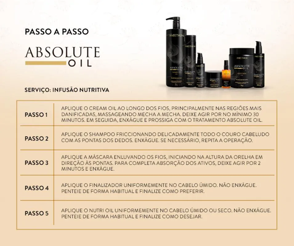 Aneethun Absolute Oil – Máscara Capilar 1kg Máscara capilar para cabelos secos, opacos e ressecados. A Aneethun Absolute Oil Máscara Nutritiva promove um tratamento de luxo com ação intensiva de reposição lipídica e nutrição profunda. Sua fórmula rica em óleos nobres proporciona hidratação eficaz, sedosidade e brilho, além de combater o ressecamento e o frizz. Ideal para revitalizar os fios, deixando-os mais maleáveis, macios e com toque aveludado. Benefícios: