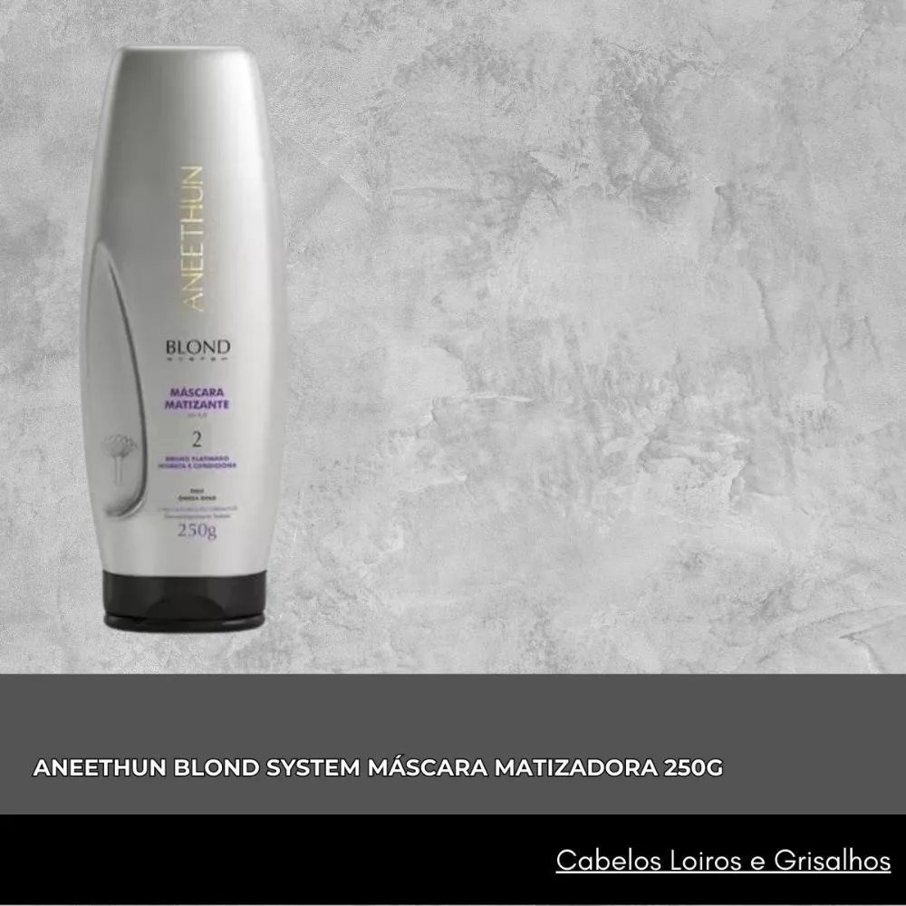 vitamina e, que juntos neutralizam o tom amarelado dos fios e minimiza o ressecamento. Mascara Aneethun Blond repõe os nutrientes perdidos ao longo do dia. Mascara Aneethun Blond possui um PH é de 4,0 por isso, pessoas que passaram por algum processo de relaxamento ou