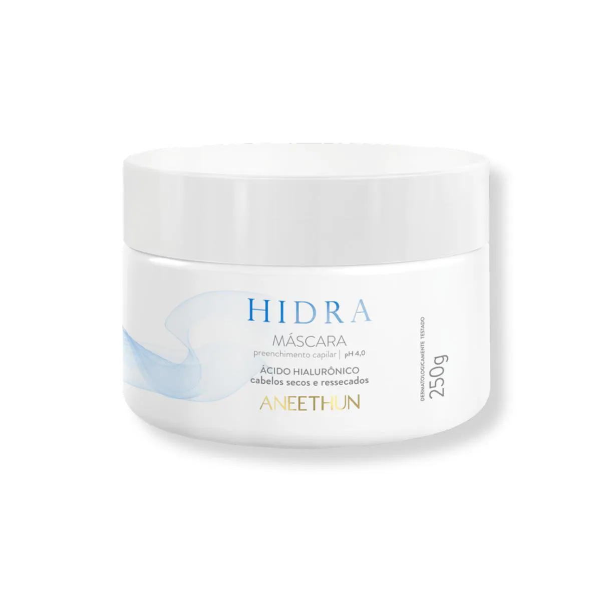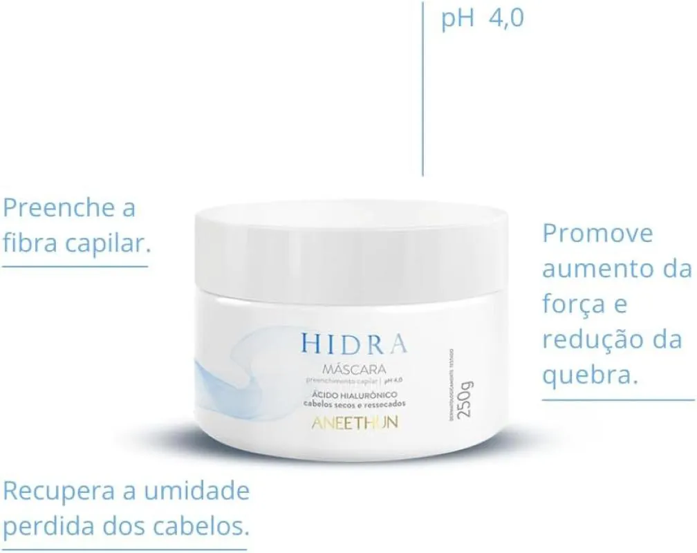 Recupera a umidade perdida e fortalece a fibra capilar, deixando os fios hidratados, macios e brilhantes. A Máscara Capilar Aneethun Hidra atua profundamente em todas as camadas do fio, promovendo o equilíbrio hídrico interno e formando um manto lipídico protetor que alinha as cutículas. Seus ativos exclusivos retêm a umidade natural, devolvendo vitalidade, maleabilidade e resistência aos cabelos. Com fórmula altamente hidratante e pH 4,0, proporciona resultados duradouros, aumentando a força dos fios, reduzindo a quebra, combatendo o frizz e elevando a maciez e o brilho.Benefícios