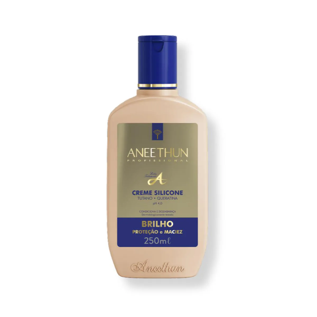 Aneethun Linha A - Creme de Silicone 250ml O Creme de Silicone Aneethun Linha A é um finalizador multifuncional desenvolvido para proporcionar hidratação, proteção e brilho aos cabelos normais a secos. Sua fórmula enriquecida com tutano, queratina e D-pantenol oferece cuidados diários que revitalizam os fios, deixando-os mais saudáveis e macios. Benefícios: