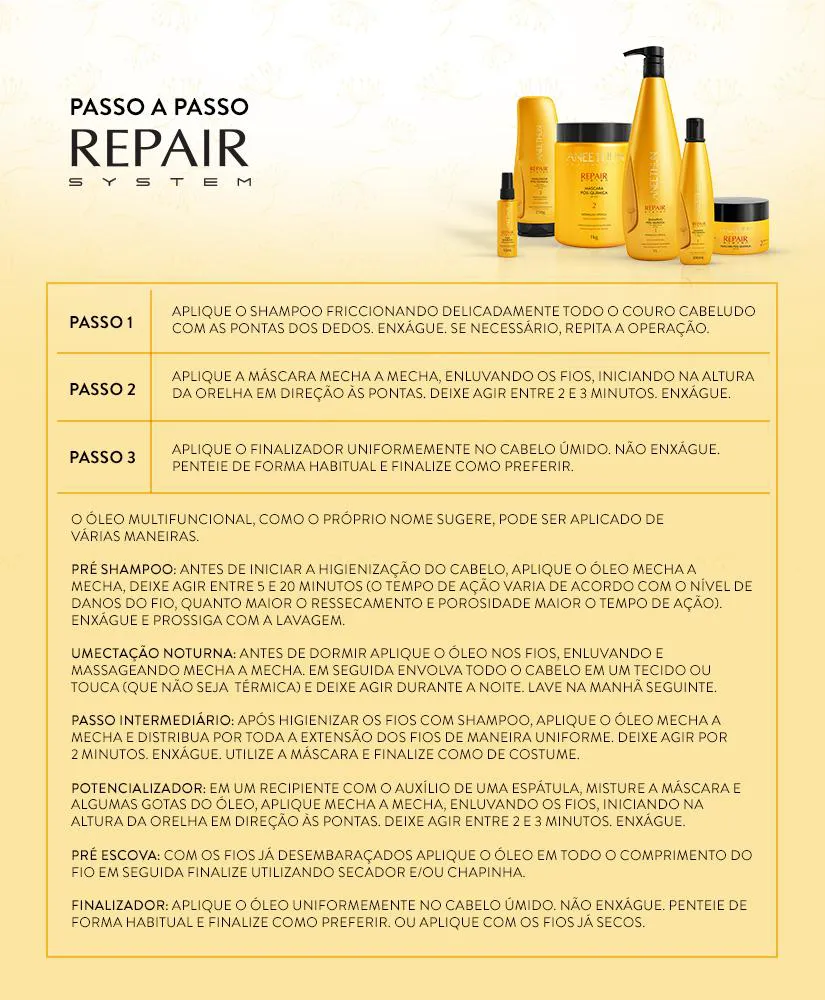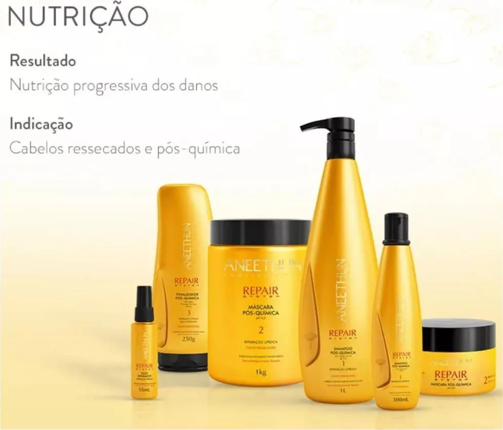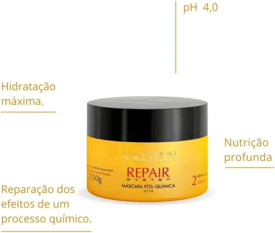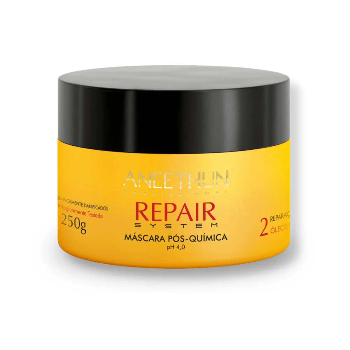 Máscara capilar especialmente formulada para cabelos com química, a Máscara Pós-Química Aneethun Repair System promove hidratação, nutrição e reparação profunda dos fios. Enriquecida com poderosos óleos reparadores, fortalece a fibra capilar, devolve elasticidade e resistência, prevenindo a quebra, o frizz e as pontas duplas. Benefícios:- Hidratação intensa e nutrição profunda