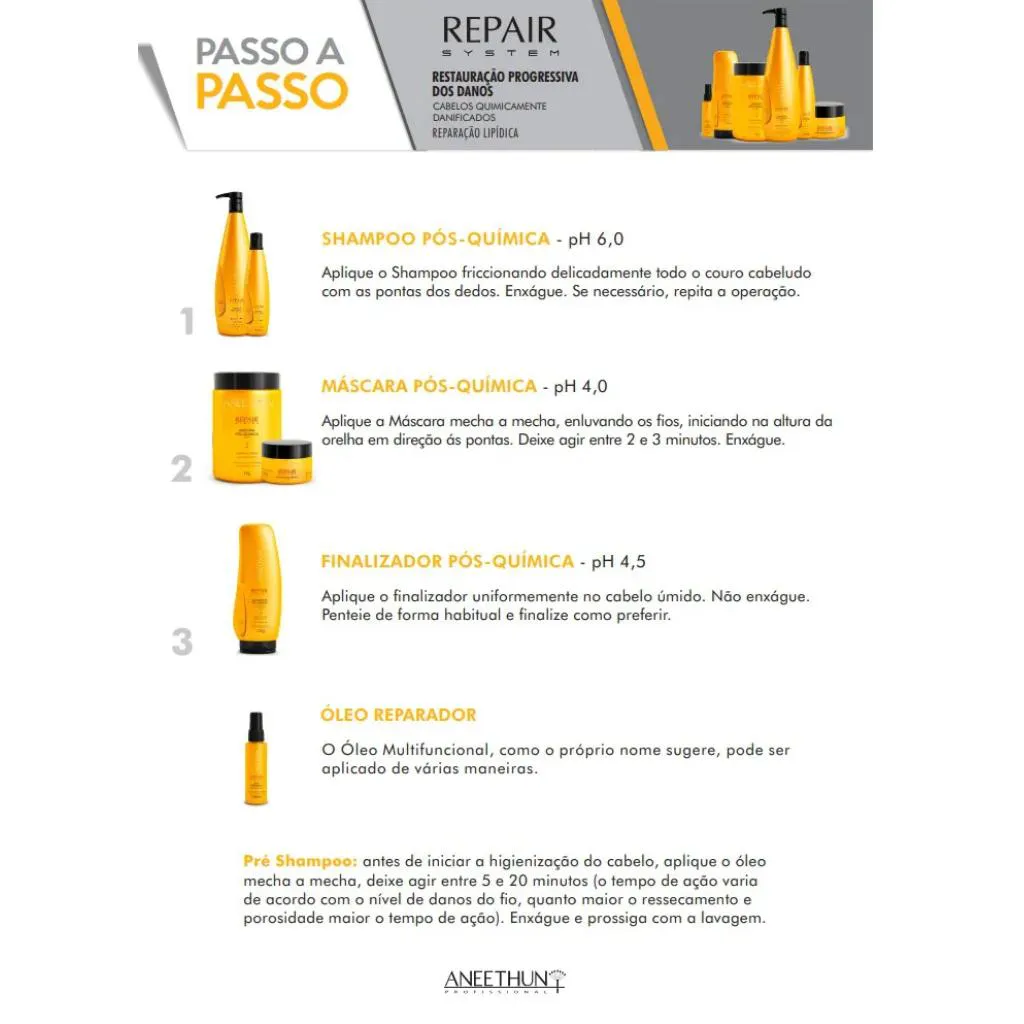 Aneethun Repair System – shampoo Pós-Química 300ml O Shampoo Pós-Química da linha Repair System da Aneethun é um tratamento profissional indicado para cabelos danificados por processos químicos como coloração, descoloração e alisamentos. Sua fórmula suave, com pH 6,0, promove uma limpeza condicionante que trata os fios desde a fibra interna até a cutícula. Benefícios: